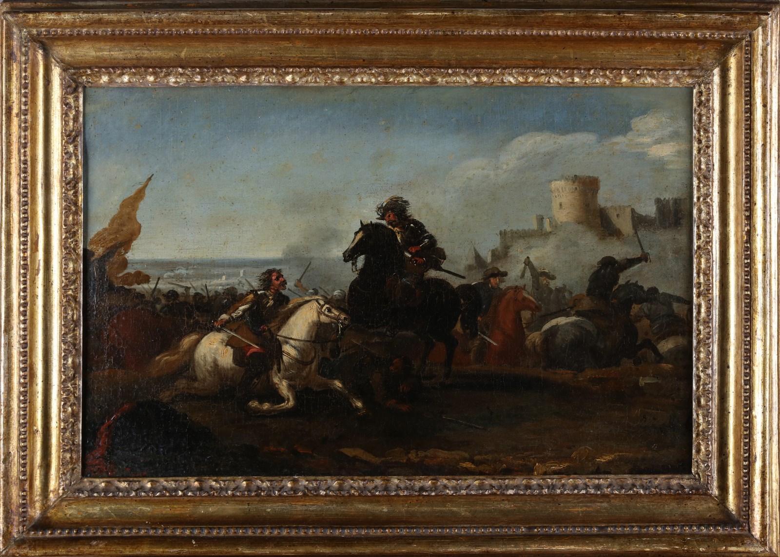 ARTISTA DEL XVIII SECOLO Battaglia di cavalleria. Olio su tela . Cm 49,00 x 32,50. . Cornice presente
