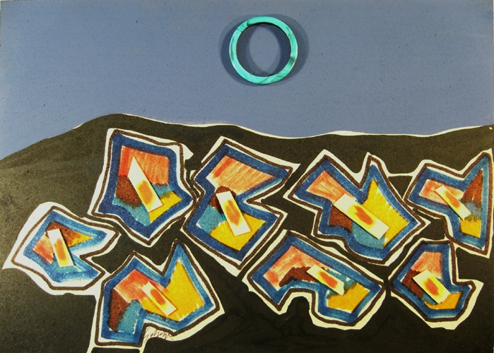 Dangelo sergio " Paysage a la mode/margherite di città "Tecnica mista e collage su legno( gem/coll/ogg) cm 60 x 43 anno 1973 firmata in basso a sinistra,sul retro datata e intitolata e firmata- etichetta Gall.Annunciata(Mi), Prov.COLLEZIONE PRIVATA