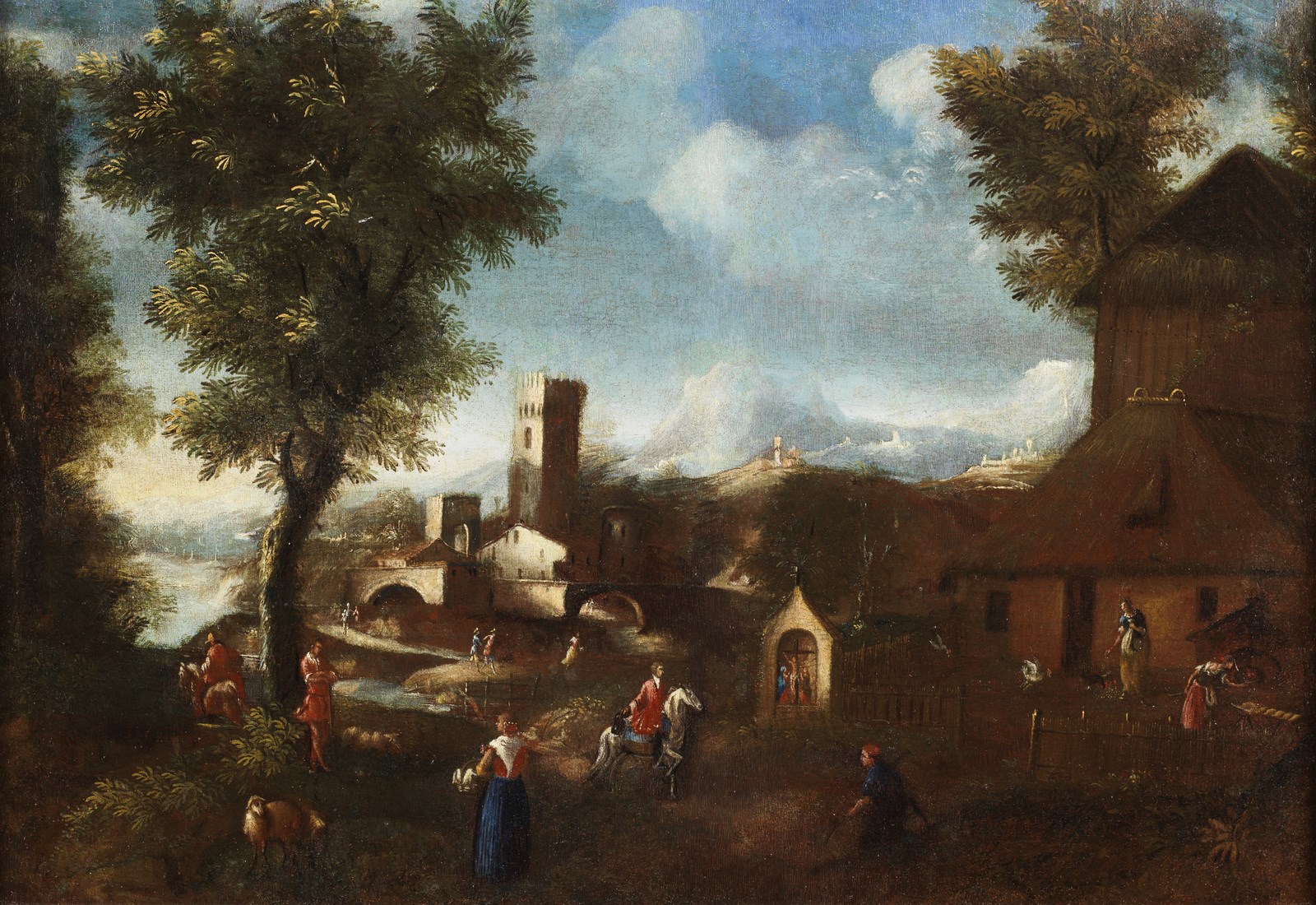 TOMASO PORTA Paesaggio con cavaliere e villani nei pressi di un borgo. .