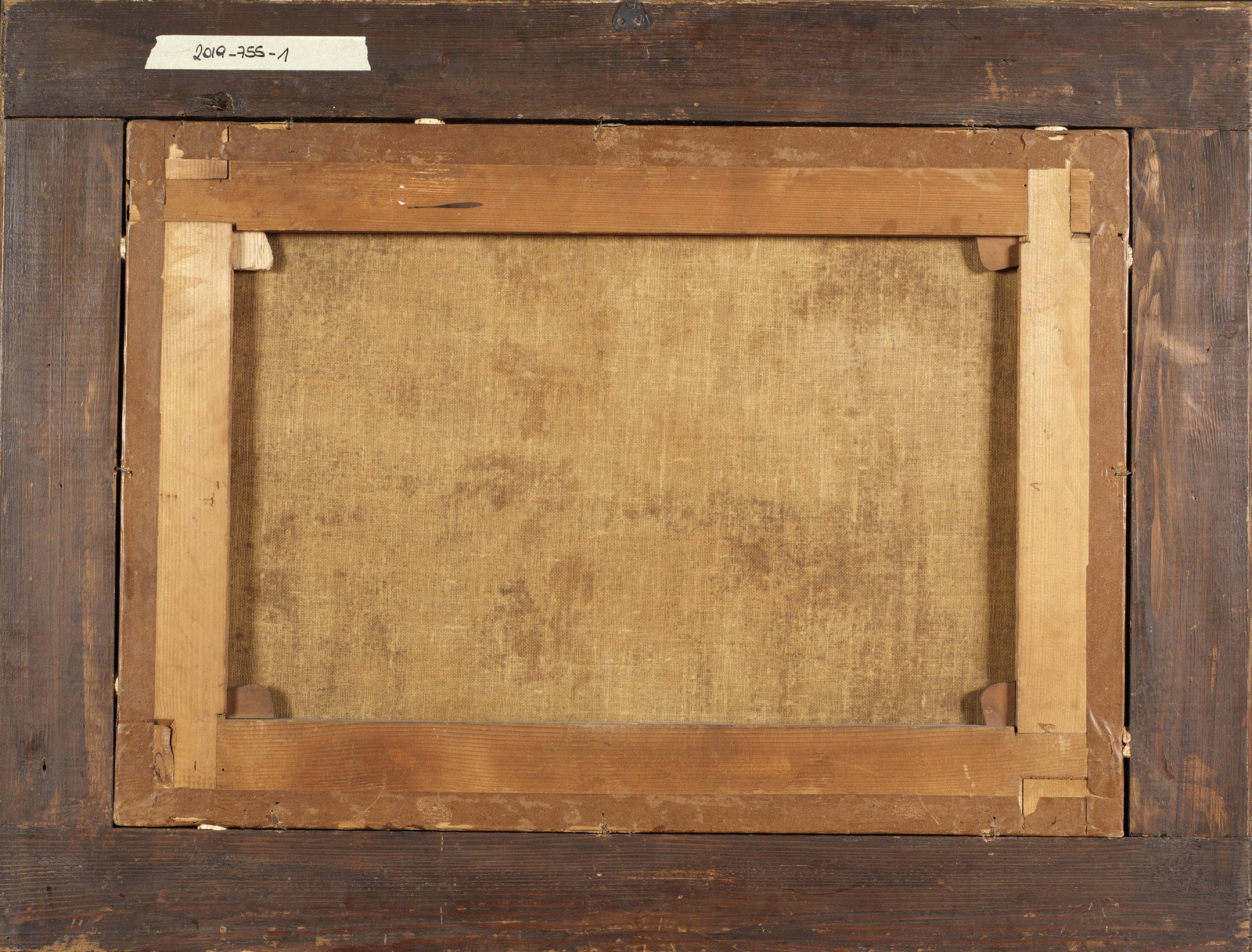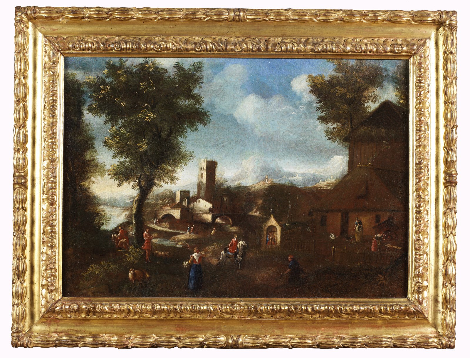 PORTA TOMASO (1686 - 1766) Paesaggio con cavaliere e villani nei pressi di un borgo. . Olio su tela . Cm 72,00 x 52,00. L'opera è accompagnata dalla scheda a cura di Federica Spadotto.. Cornice presente