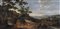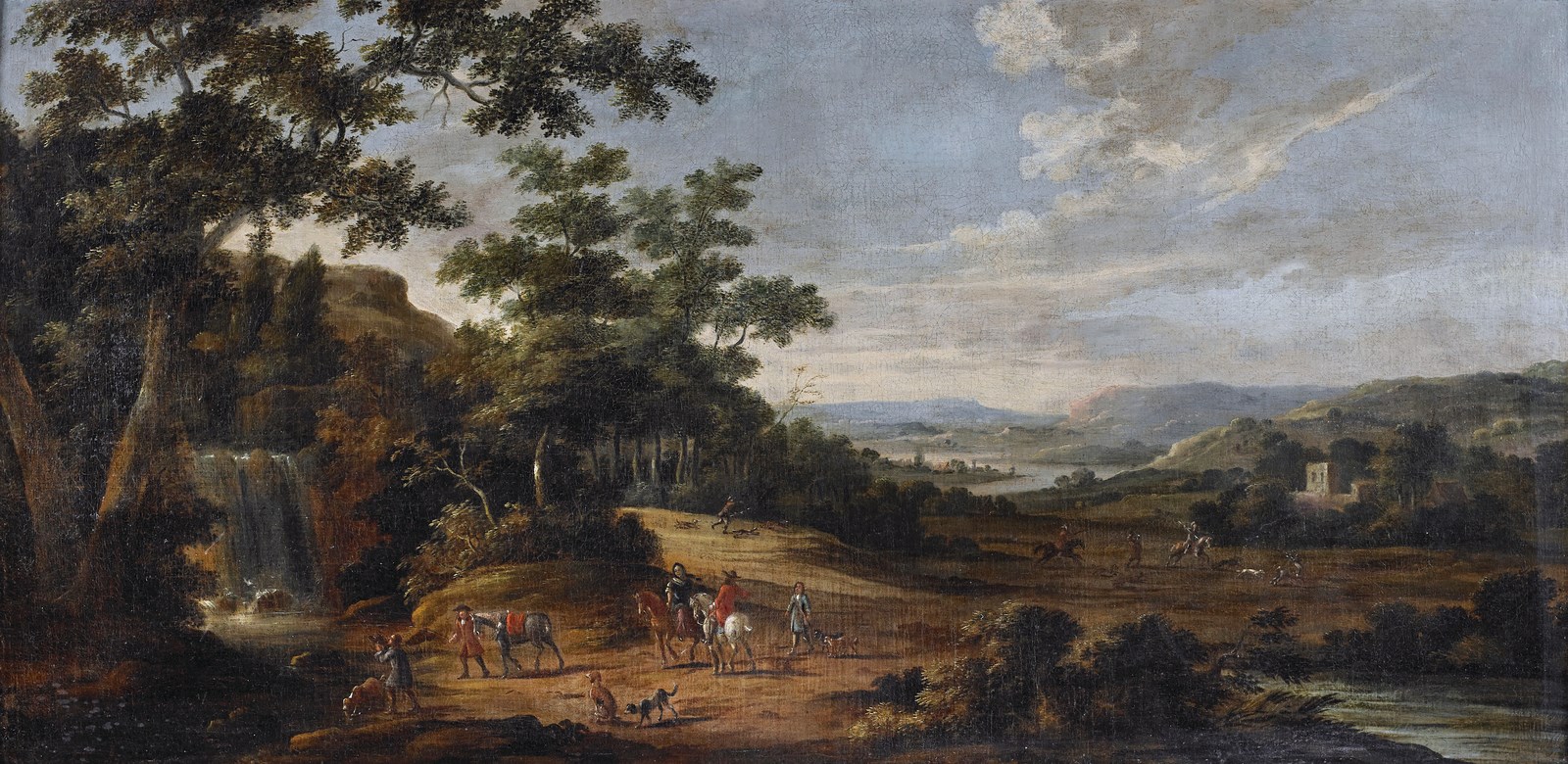 JAN BOTH Attribuito a. Paesaggio con fiume e cavalieri.