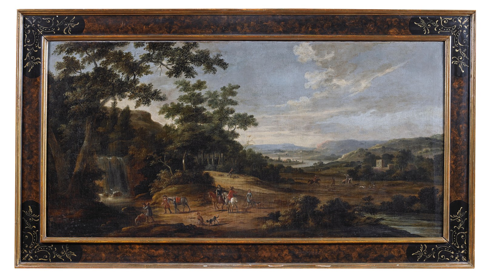 BOTH JAN (1615 - 1652) Attribuito a. Paesaggio con fiume e cavalieri. Olio su tela . Cm 150,00 x 74,00. . Cornice presente