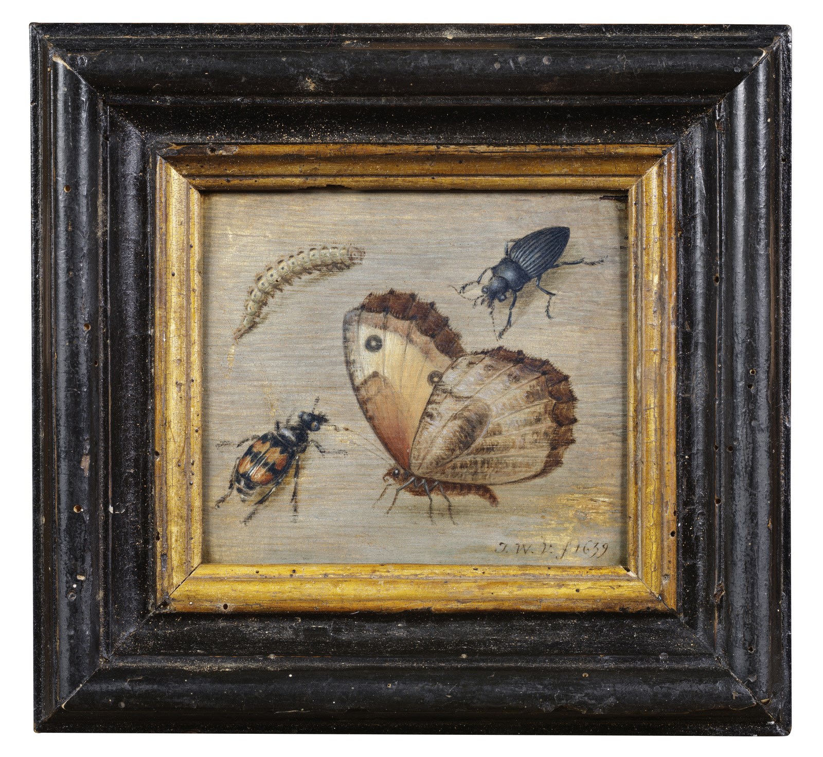 VOSMAER JACOB WOUTERSZ (1584 - 1641) Studio di Insetti. Olio su tavoletta. Cm 12,00 x 11,00. Firmato e datato 1639 in basso a destra.Provenienza: Collezione Privata. Pittore olandese, probabilmente parente di Wosmaert de Delft, Jacob Vosmaer si forma nella sua città natale, Delft, della cui Gilda entra a far parte prima del 1613. Verso il 1608 compie un primo viaggio in Italia e vi ritorna ancora nel 1629. Ad eccezione di questi due spostamenti, tuttavia, trascorre tutta la sua esistenza nella città olandese. Dopo esser entrato pienamente tra le fila della classe borghese benestante di Delft, Vosmaer viene insignito del titolo di "Capitano Maggiore" della Guardia Civica. Inizialmente si dedica alla pittura di paesaggio (secondo la testimonianza dello storico Houbraken), motivo per il quale la sua produzione può essere accostata a quella di Helias Verhulst (1570-1620 circa, Paesi Bassi) : un suo Paesaggio marino è citato infatti in un inventario di Delft del 1626 (riportanto da Montias) e una veduta di Mookerheide è elencata nell'inventario redatto alla sua morte. In un secondo momento i suoi interessi si indirizzano invece verso il genere della Natura morta - attualmente si conoscono suoi dipinti solo di questa tipologia - e l'artista predilige prevalentemente composizioni di fiori e frutta. Sovente, in questo tipo di raffigurazioni, Vosmaer inserisce fiori molto rari, che riesce a vendere ai collezionisti a prezzi molto elevati, ulteriore testimonianza della fama che l'artista ha raggiunto. Un dipinto dal titolo A vase with Flowers, firmato e datato 1613 (olio su tavola, inv. n. 71.5), è conservato presso il Metropolitan Museum di New York. La tavoletta in oggetto, firmata e datata, rappresenta certamente una rarità nella produzione di Vosmaer, per le piccole dimensioni e per il soggetto. L'accostamento di curiosi insetti e la loro dimensione, quasi naturale, che permette la visione dei loro più piccoli particolari anatomici, rimandano più che alle Nature morte pittoriche alle composizioni naturalistiche dei trattati scientifici dell'epoca. Nell'opera è infatti apprezzabile l'elevata qualità della pennellata, sottile e meticolosa. Le indagini rilettografiche a cui la tavola è stata sottoposta hanno documentato inoltre come la firma sia autentica e il disegno sottostante sia molto accurato, delimitando con estrema precisione i contorni delle figure. . Cornice presente