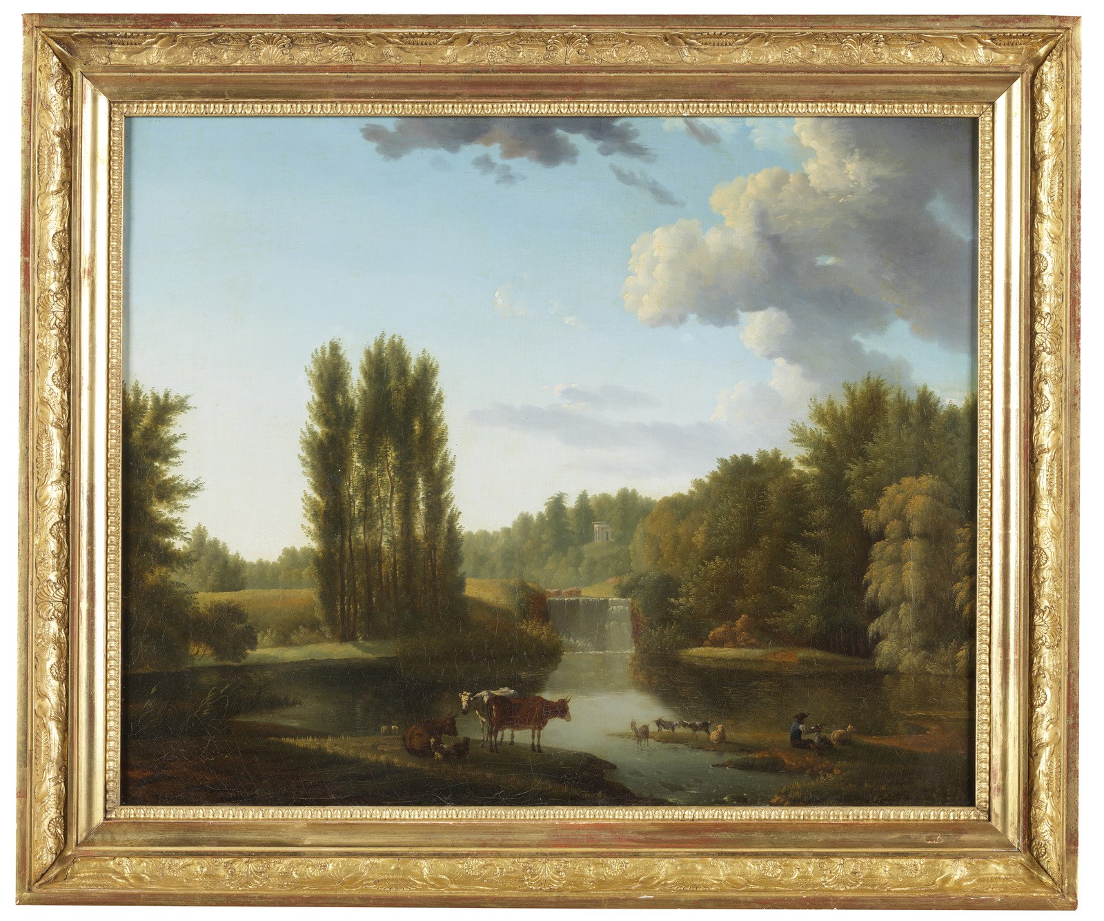 DUNOUY ALEXANDRE HYACINTHE (1757 - 1841) Paesaggio con armenti e fiume. . Olio su tela . Cm 59,00 x 49,00. Al retro timbro Giroux a Paris.Provenienza: Collezione Privata; Sotheby's, New York, 18 Maggio 2006, Old Masters Painting, lotto 214.L'opera verrà inserita nel Catalogue Raissoné di Corinne Polycarpe Chorier. Nato a Parigi, il giovane Dunouy compie la sua formazione sotto la direzione del pittore Gabriel Briand (1725-1777); inizia così a dipingere vedute della città natale e delle contrade vicine ed espone per la prima volta le sue opere presso il Salon de Paris del 1791. Desideroso di conferire alla propria professionalità ampio respiro internazionale, compie a più riprese dei viaggi in Italia (sembra già dalla fine degli anni 80 e verso il 1802, ma il soggiorno certo è quello del 1810-1815). Mete irrinunciabili dei suoi itinerari sono le città di Roma e di Napoli, le cui zone limitrofe dipinge con accuratezza. Le composizioni di paesaggio del Maestro vengono esposte con regolarità fino al 1833 ai Salons parigini dove viene premiato con due medaglie (1819 e 1827). Nel 1810 diviene pittore ufficiale della regina Carolina e del re Gioacchino Murat, nominato sovrano di Napoli da Napoleone, e riceve l'incarico di eseguire paesaggi per il Palazzo Reale di Portici. In Italia subisce l'influenza del pittore tedesco Jakob Philipp Hackert (1737-1807) che incontra a Napoli. Una volta rientrato definitivamente in Francia, il Maestro incide all'acquaforte una serie di paesaggi (circa trenta) sulla base di propri dipinti e disegni (ora conservati al Gabinetto di Stampe della Biblioteca Nazionale di Parigi). Durante il periodo della maturità viene incaricato dal Re di Francia Luigi XVIII di studiare, con la collaborazione di altri noti artisti, dei progetti per la decorazione di molteplici castelli (che erano residenze reali) tra cui quello di Fontainebleau. Le figure nelle opere di Dunouy sono per lo più realizzate da altri artisti tra cui Nicolas-Antoine Taunay e Jean-Louis Demarne, con quest'ultimo l'artista ha collaborato dipingendo la parte paesaggistica dell'Incontro tra Napoleone e Pio VII nella foresta di Fontainebleau (1808, Versailles). Le sue opere sono esposte in molte località francesi tra cui Lione, Orleans, Parigi e Versailles. Dei suoi paesaggi sono conservati anche in Italia presso la Galleria Nazionale di Capodimonte (Napoli).La composizione rivela l'essenza della concezione pittorica del Maestro e le tecniche sono quelle tipiche della scuola francese; la scelta di un luogo anonimo, la casualità dello scorcio, la registrazione delle variazioni di luce e colore e la densità della stesura pittorica. Peculiare di Dunouy è la vocazione a costruire l'immagine attraverso una sequenza di piani: il gregge con il pastore, la cascata e infine un tempietto, che scandisce il passaggio dall'ombra alla luce. L'inserimento di una citazione colta, un'architettura che ricorda il Tempio di Vesta a Roma, dimostra come il pittore abbia studiato dal vero il paesaggio italiano e come nel successivo lavoro condotto in atelier abbia inserito il frammento nel contesto di un paesaggio di campagna. L'artista interpreta, infatti, i particolari osservati in prima persona secondo una nuova prospettiva; il dato naturale viene così ricreato secondo un'ottica dove anche la vita campestre, con le sue fatiche quotidiane, acquista un valore mitico, indipendente dalle coordinate spazio-temporali. . Cornice presente