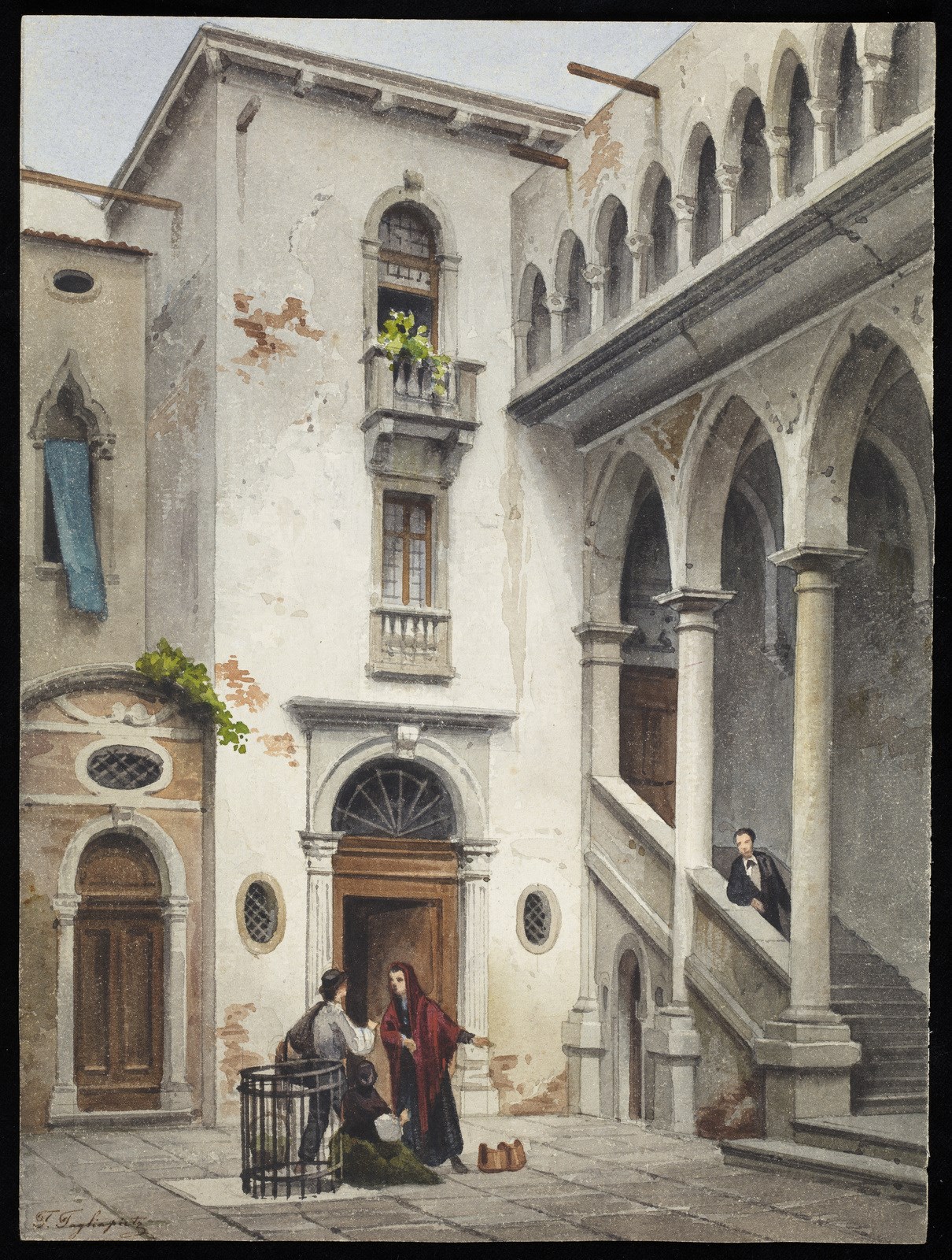 TAGLIAPIETRA TRANQUILLO (1867 - 1906) Interno di Palazzo da Mula con figure. . Acquarello su carta. Cm 17,00 x 23,00. Firmato in basso a sinistra. Al retro indicazioni sull'ubicazione.