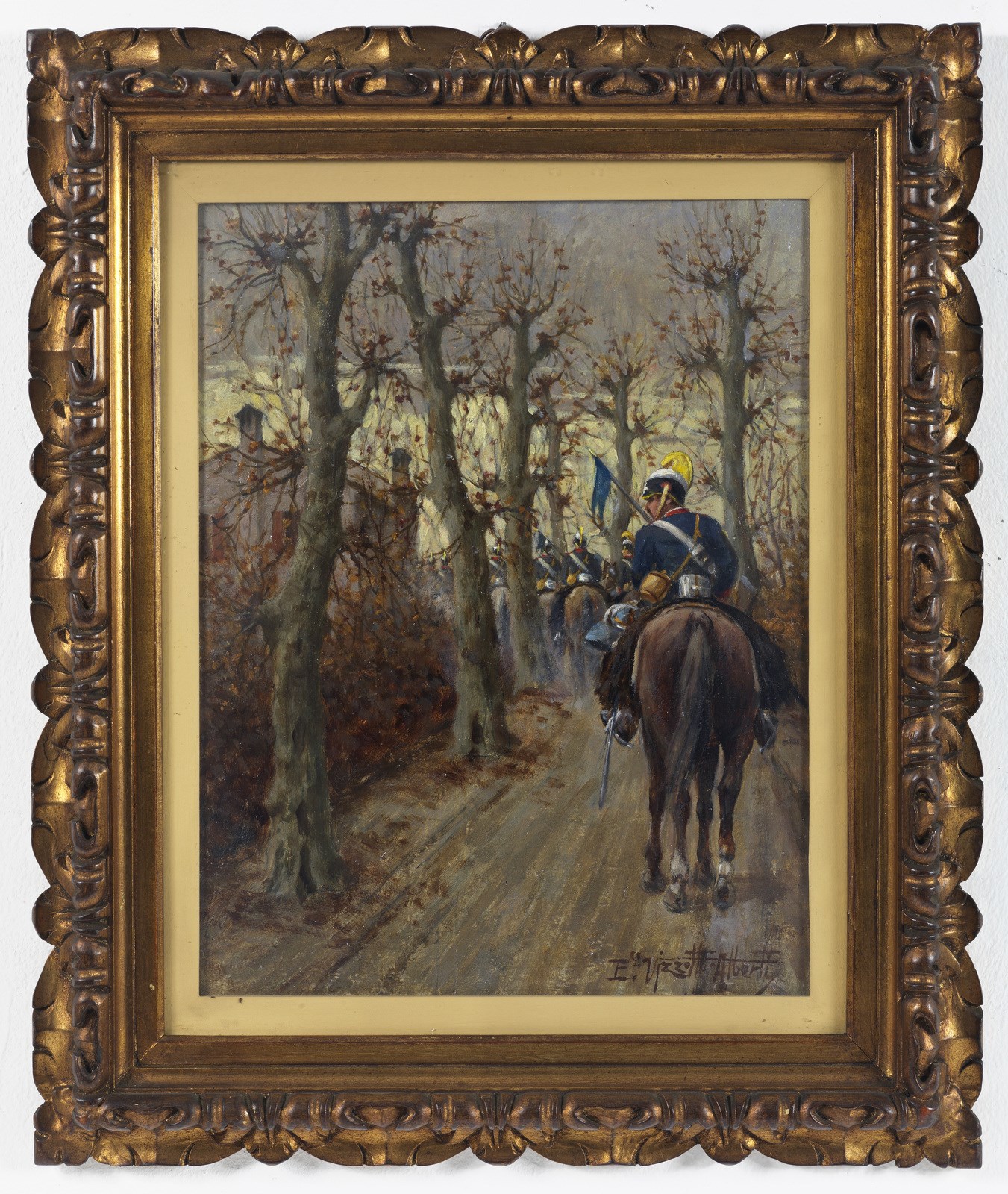 VIZZOTTO-ALBERTI ENRICO (1880 - 1976) Cavalleggeri. . Olio su cartone. Cm 35,00 x 46,00. Firmato in basso a destra. Cornice presente