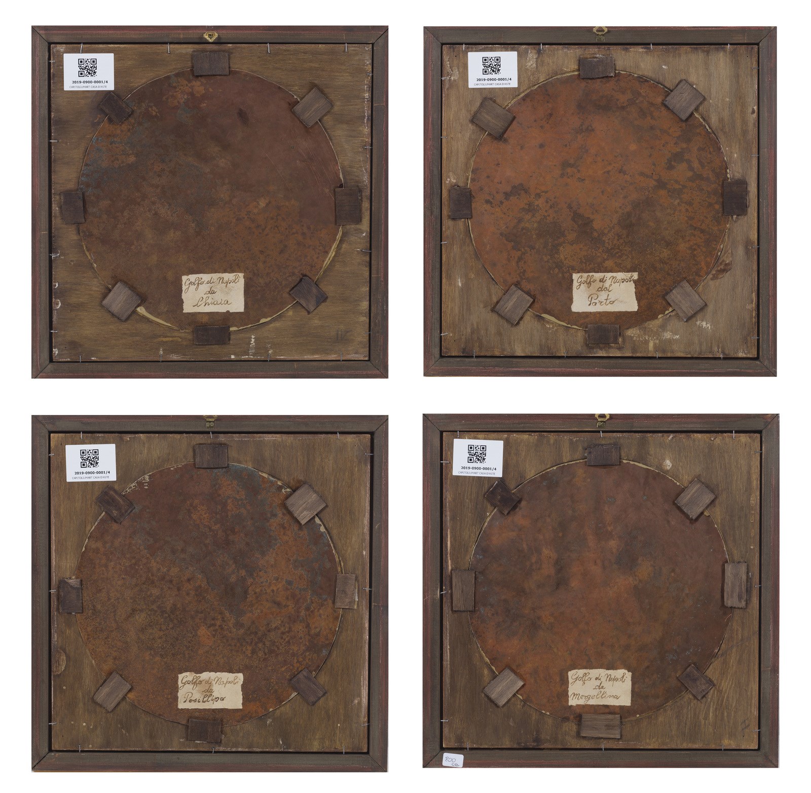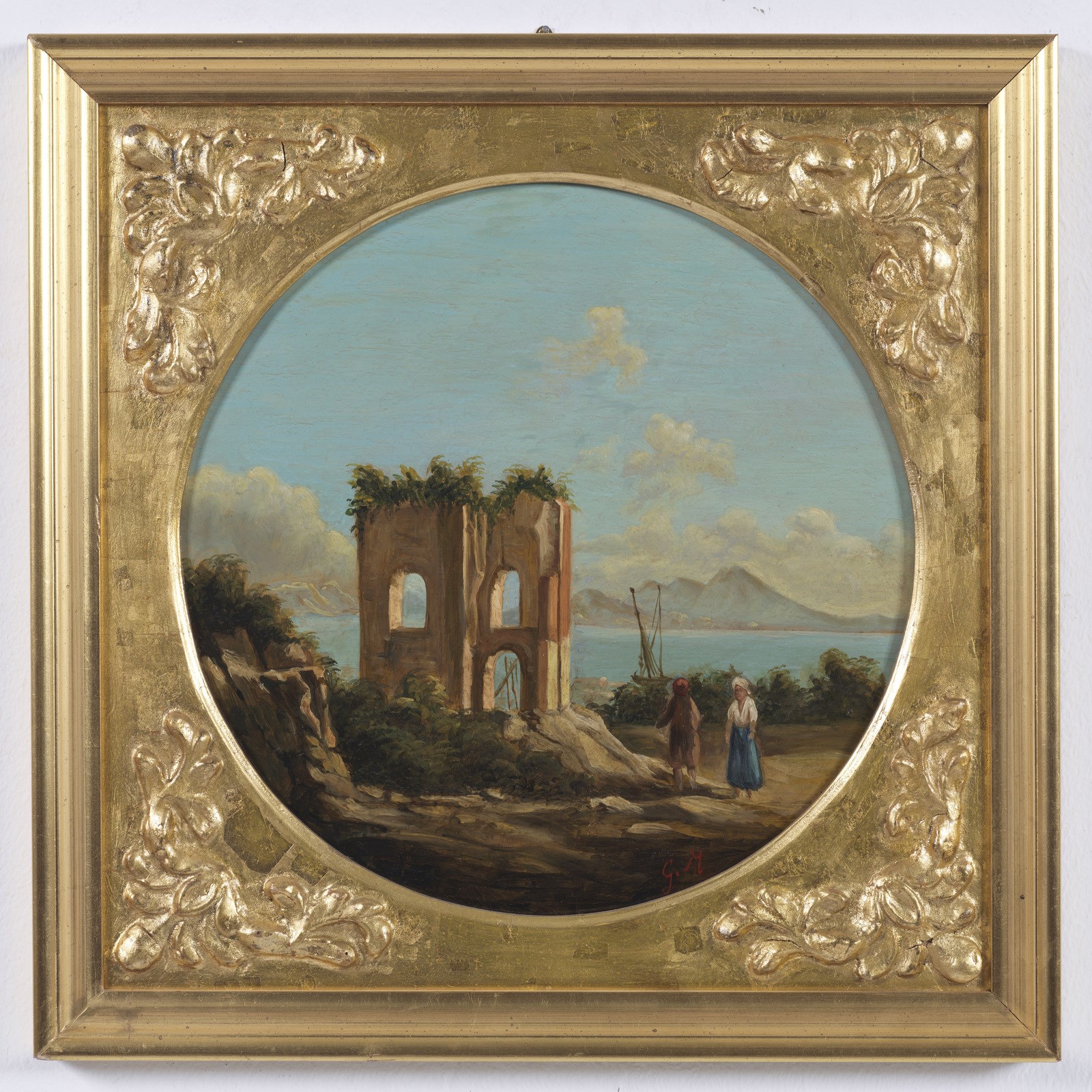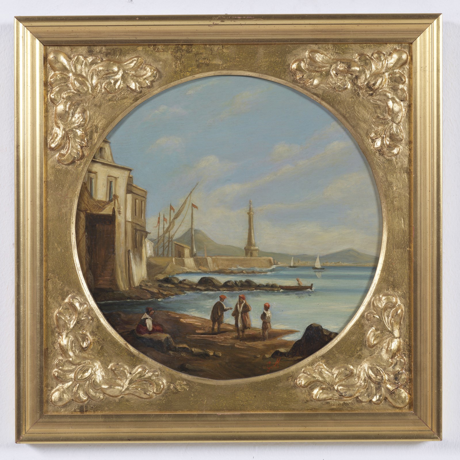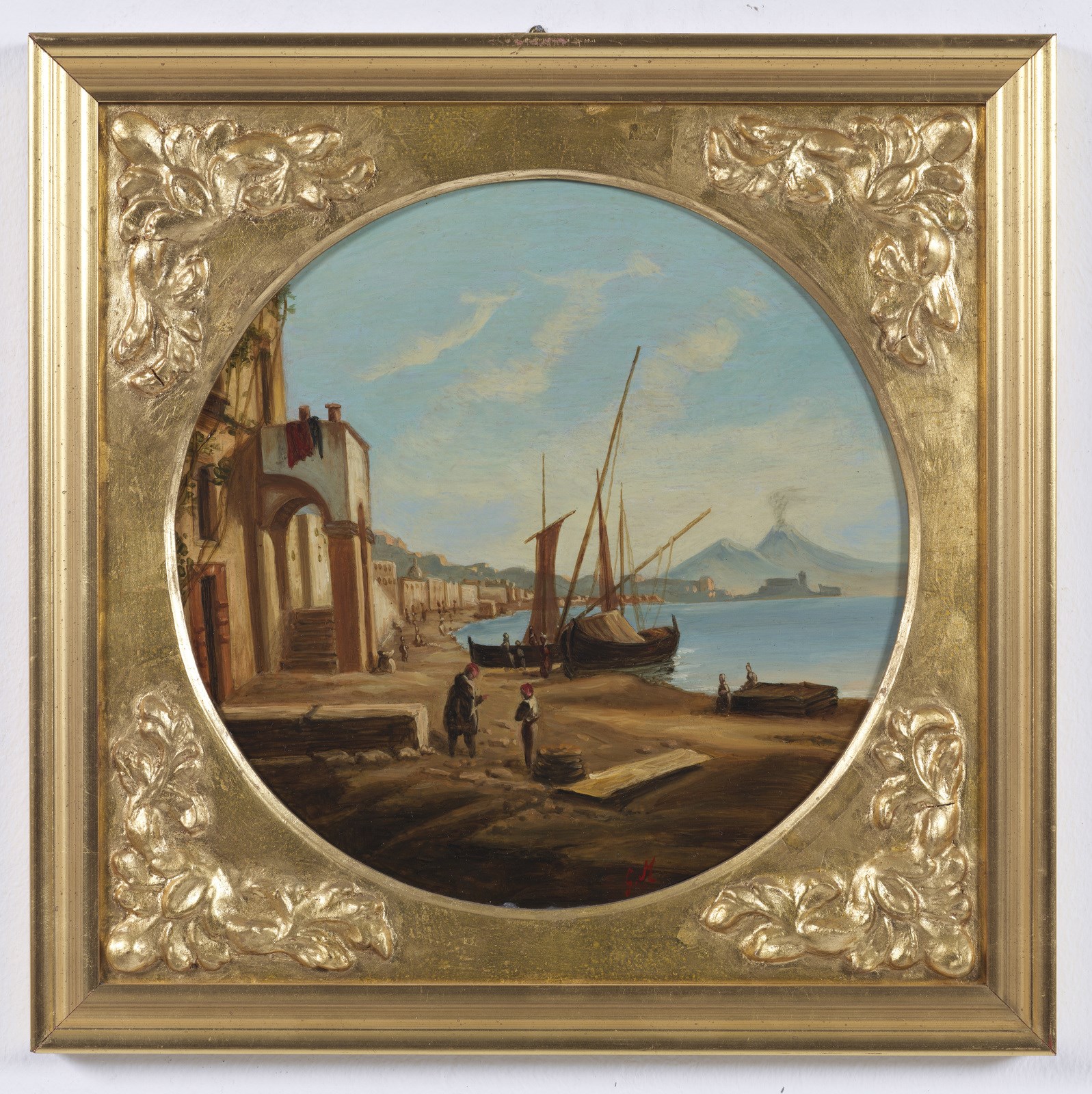 MORMILE GAETANO (1839 - 1890) Gruppo di 4 vedute napoletane. . Olio su rame. Cm 28,00 x 28,00. Monogramma in basso a destra. Una serie di quattro dipinti ad olio su rame, tondi, incorniciati da "cartelle" dorate di epoca Luigi Filippo (restaurate), a loro volta completate da listelli dorati moderni "in stile".Tutti recano il monogramma G.M. in colore rosso, identificato con buona certezza nel nome dell'autore Gaetano Mormile, attivo a Napoli nella seconda metà dell'Ottocento e noto per le caratteristiche vedute e scene di vita quotidiana ambientate esclusivamente nella città partenopea.Sul retro ogni dipinto reca l'identificazione della località rappresentata su cartigli probabilmente applicati dallo stesso autore: Golfo di Napoli dal porto, Golfo di Napoli da Chiaia, Golfo di Napoli da Mergellina, Golfo di Napoli da Posillipo. La produzione "seriale" di questo tipo di manufatti, richiestissimi tra il XVIII ed il XIX secolo e finalizzata appunto a soddisfare la grande richiesta da parte di turisti perlopiù stranieri, giustifica a nostro parere una certa "retoricità" della composizione nonchè la scelta di apporre le sole iniziali del proprio nome, laddove in dipinti dalla committenza più elevata il pittore era solito firmarsi per esteso; da notare che le iniziali nel monogramma sono perfettamente sovrapponibili a quelle della sua firma per esteso. . Cornice presente