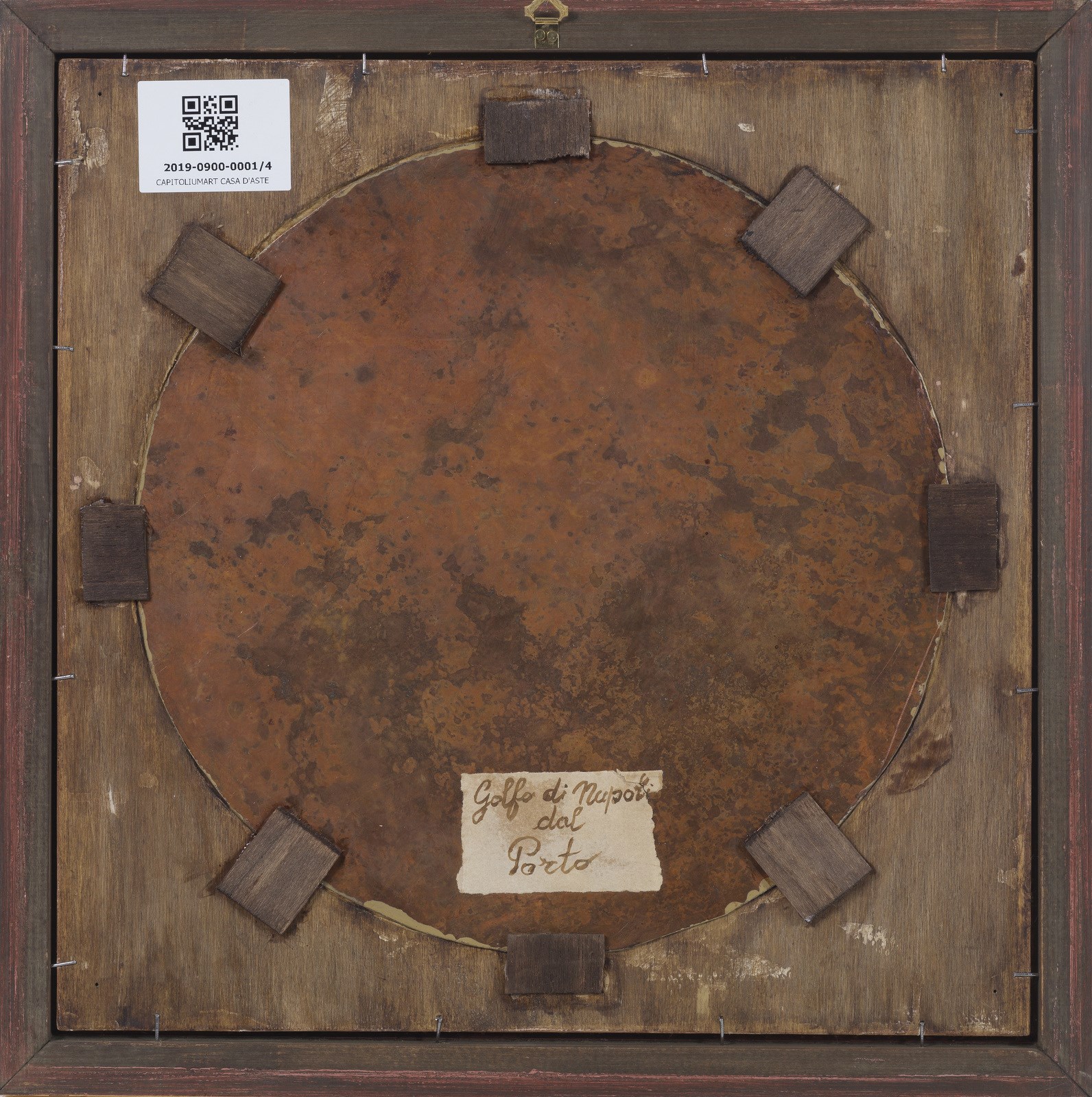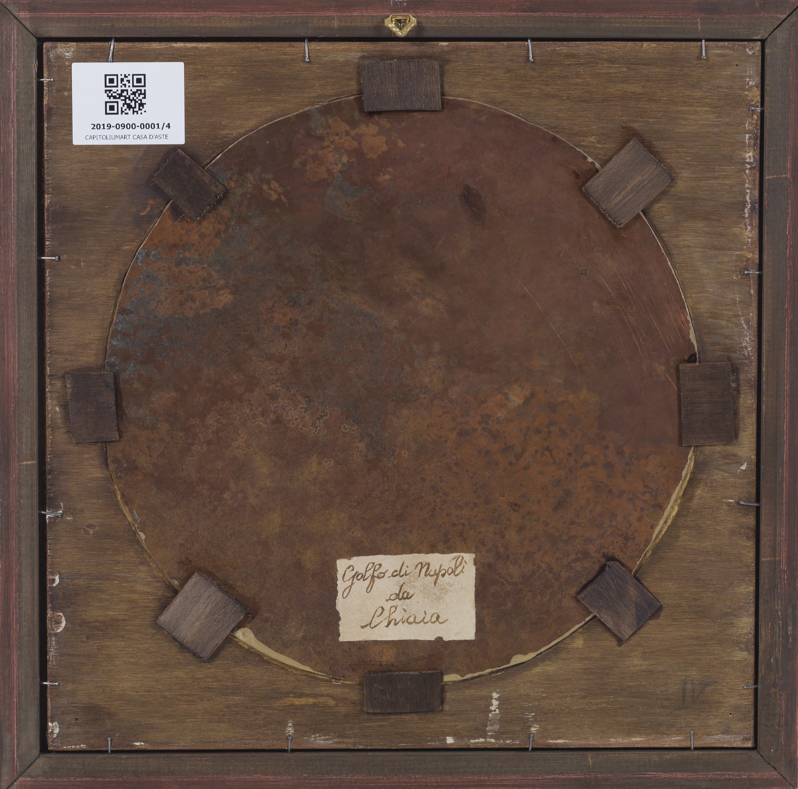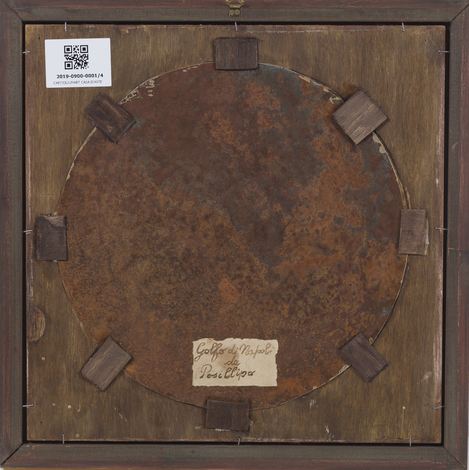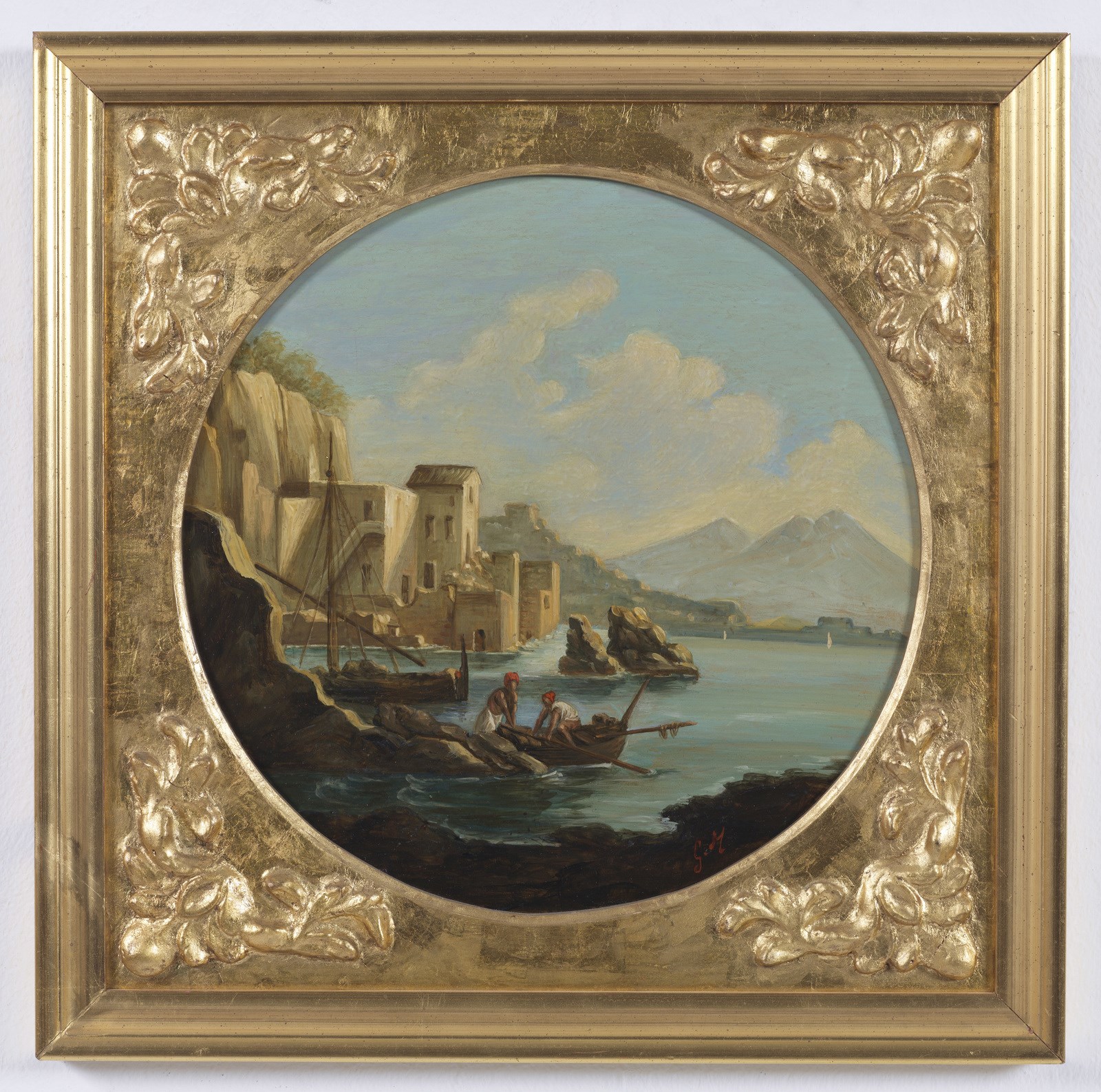 MORMILE GAETANO (1839 - 1890) Gruppo di 4 vedute napoletane. . Olio su rame. Cm 28,00 x 28,00. Monogramma in basso a destra. Una serie di quattro dipinti ad olio su rame, tondi, incorniciati da "cartelle" dorate di epoca Luigi Filippo (restaurate), a loro volta completate da listelli dorati moderni "in stile".Tutti recano il monogramma G.M. in colore rosso, identificato con buona certezza nel nome dell'autore Gaetano Mormile, attivo a Napoli nella seconda metà dell'Ottocento e noto per le caratteristiche vedute e scene di vita quotidiana ambientate esclusivamente nella città partenopea.Sul retro ogni dipinto reca l'identificazione della località rappresentata su cartigli probabilmente applicati dallo stesso autore: Golfo di Napoli dal porto, Golfo di Napoli da Chiaia, Golfo di Napoli da Mergellina, Golfo di Napoli da Posillipo. La produzione "seriale" di questo tipo di manufatti, richiestissimi tra il XVIII ed il XIX secolo e finalizzata appunto a soddisfare la grande richiesta da parte di turisti perlopiù stranieri, giustifica a nostro parere una certa "retoricità" della composizione nonchè la scelta di apporre le sole iniziali del proprio nome, laddove in dipinti dalla committenza più elevata il pittore era solito firmarsi per esteso; da notare che le iniziali nel monogramma sono perfettamente sovrapponibili a quelle della sua firma per esteso. . Cornice presente