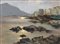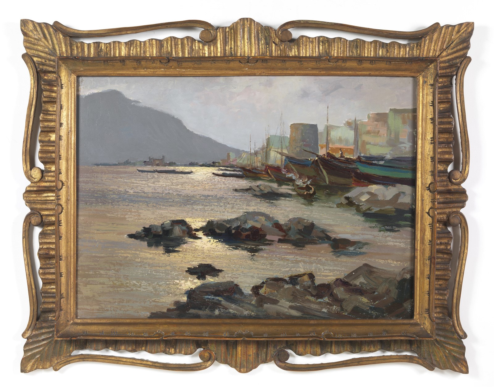 VERNI ARTURO (1891 - 1960) Porto di Paderno. . Olio su compensato. Cm 69,00 x 51,00. Firmato e titolato al retro. Cornice presente