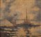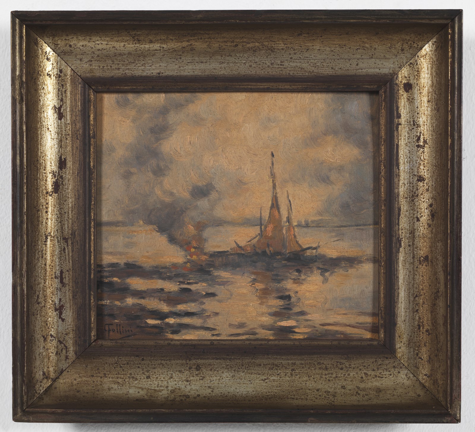 FOLLINI CARLO (1848 - 1938) Marina con barche. Olio su cartone. Cm 21,00 x 18,00. Firmato in basso a sinistra. . Cornice presente