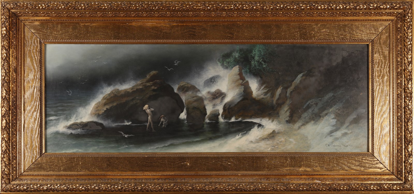 DIEFENBACH KARL WIHELM (1851 - 1913) Paesaggio marino con figure. 1899. Olio su tavola. Cm 98,50 x 34,00. Firmato, datato 1899 e luogo ( Triest) in basso a destra. Cornice presente