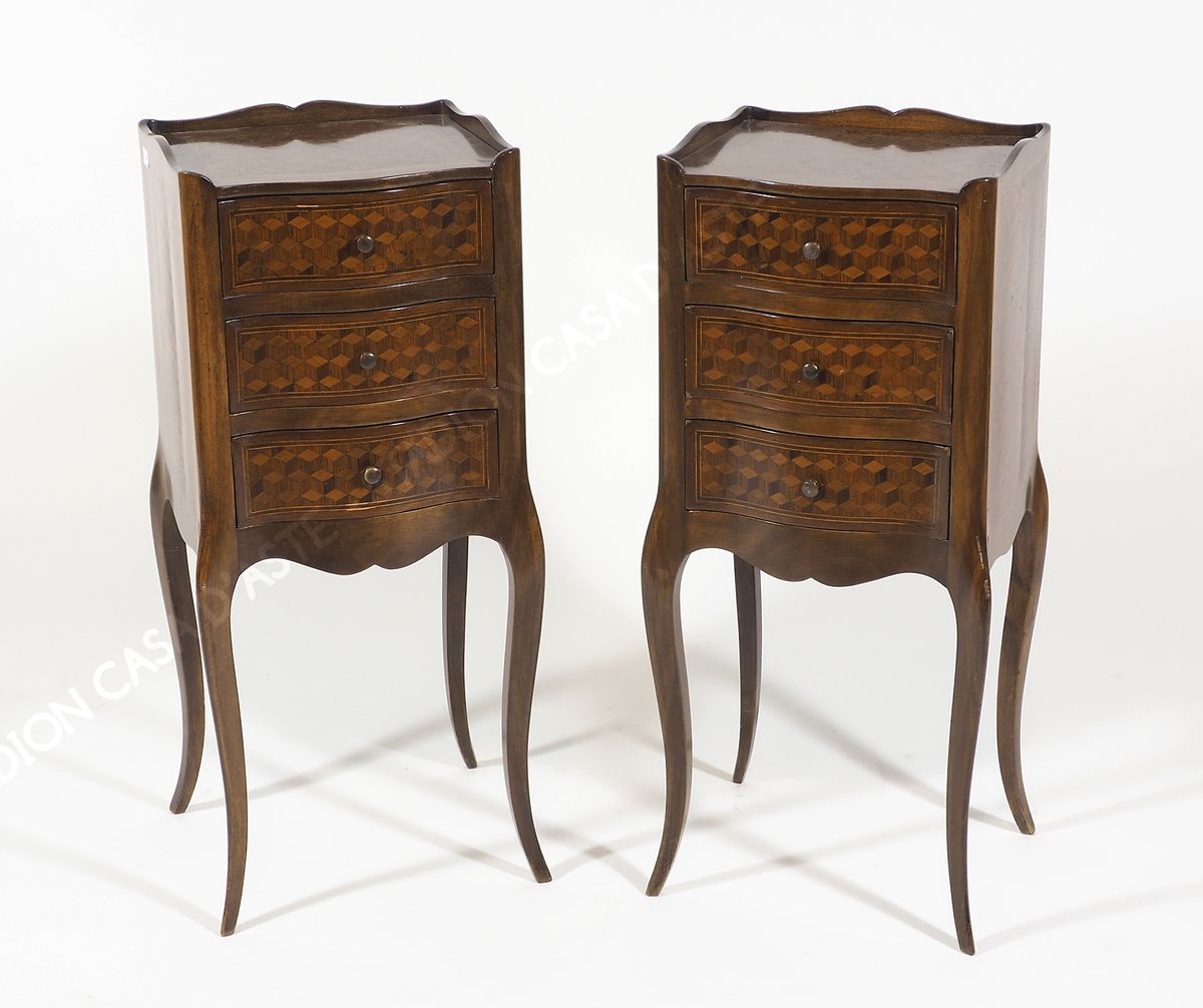 Coppia di piccoli comodini in legno a 3 cassetti su gambe a sciabola. H. cm. 75.