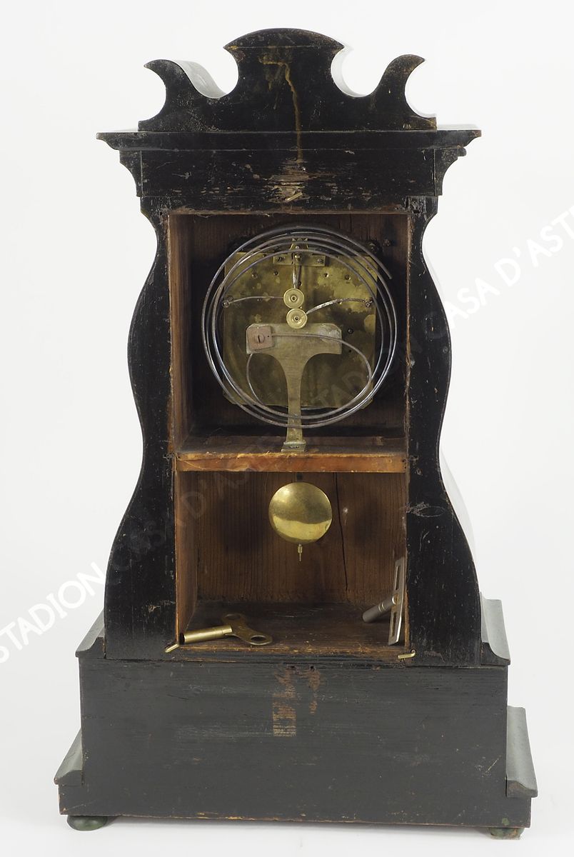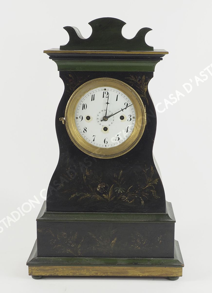 Orologio da tavolo con cassa in legno dipinto a motivi floreali. XIX secolo....