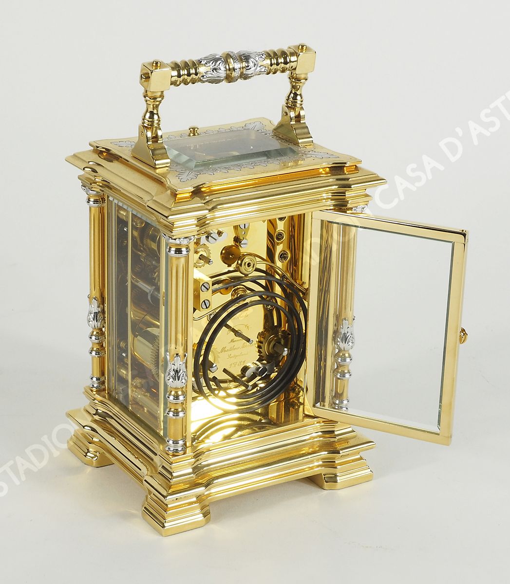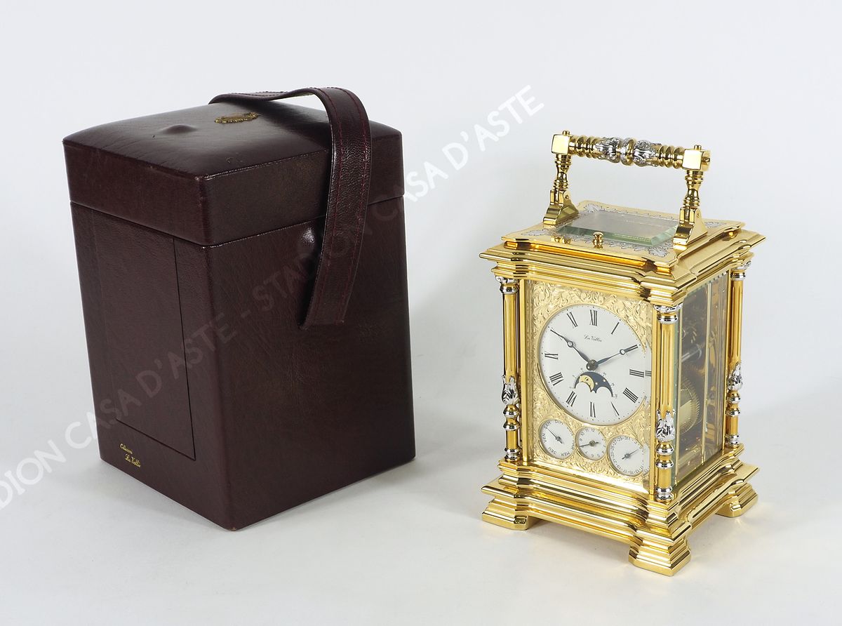 La Vallee: pendoletta da tavolo in ottone dorato. Entro custodia originale. H. cm. 21.