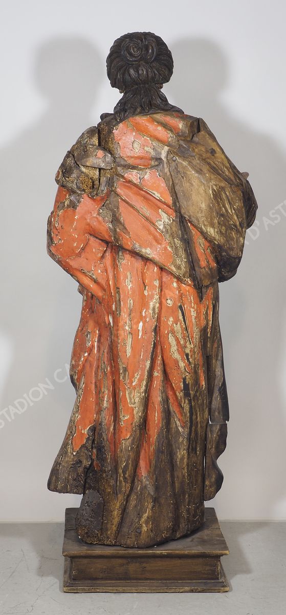 Grande scultura lignea policroma raffigurante Santa. XVII secolo. H. cm. 153.
