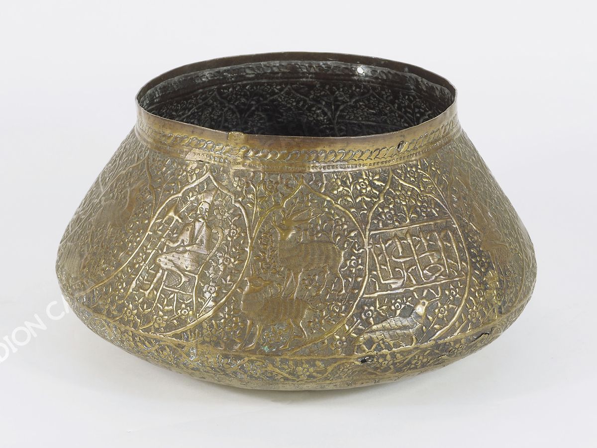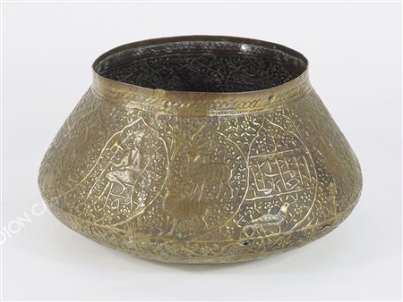 Ciotola in metallo finemente sbalzata con figure di animali e personaggi. Medio Oriente. Diam. cm. 28.