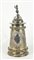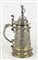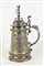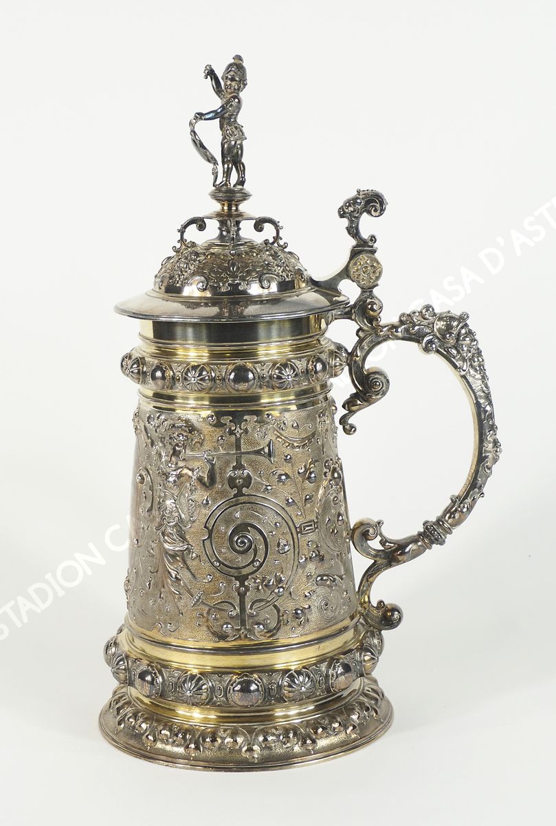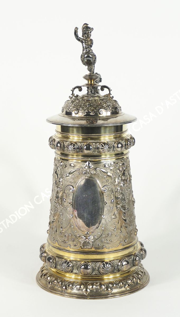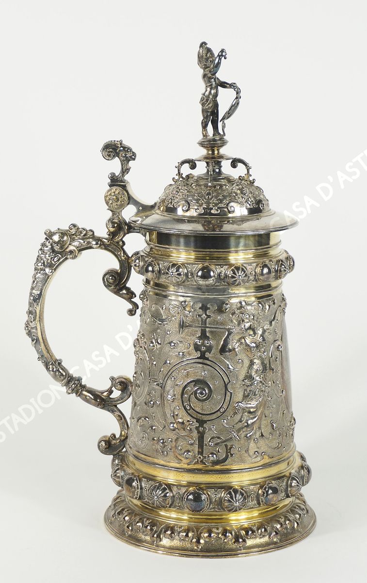Grande boccale in metallo argentato sbalzato a motivi floreali, medaglione sorretto da 2 figure femminili, sul manico testa di guerriero, sul coperchio mascheroni e ragazzino con spada. Nord Europa, II metà XX secolo. H. cm. 38.