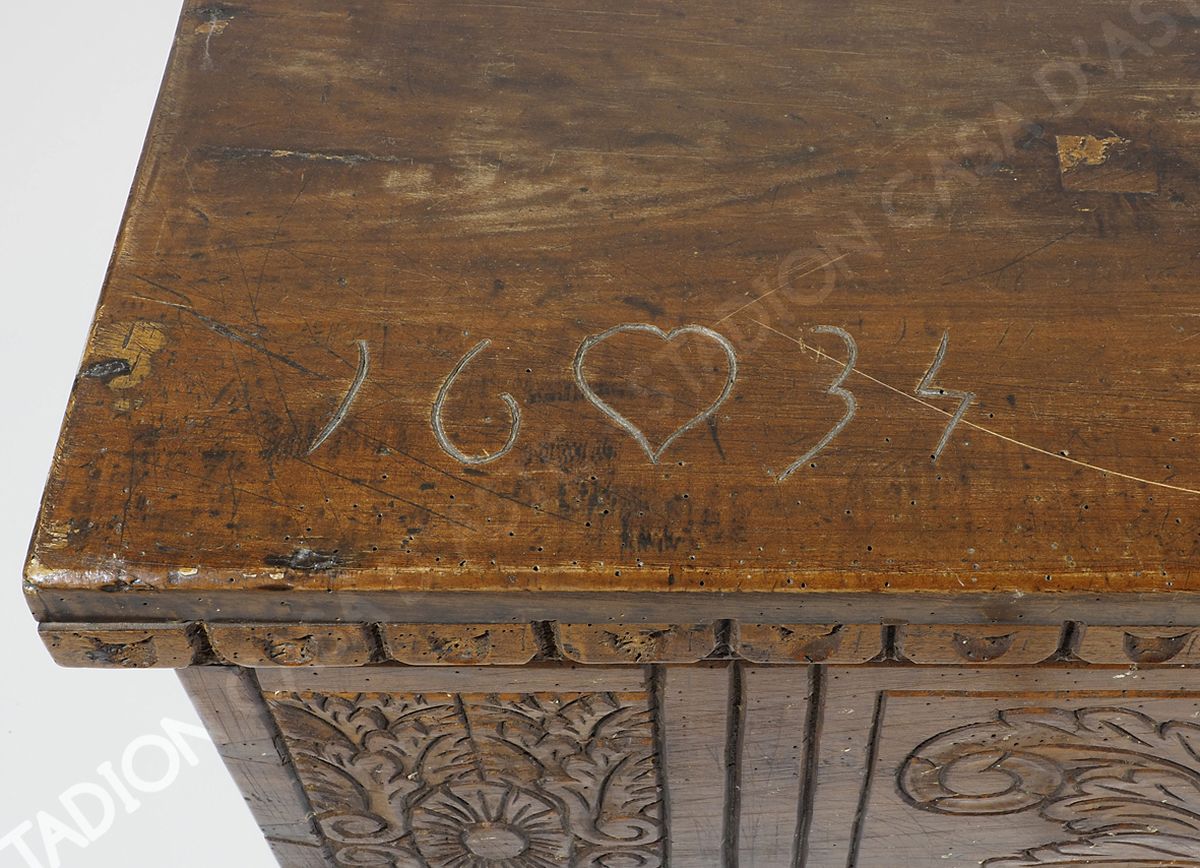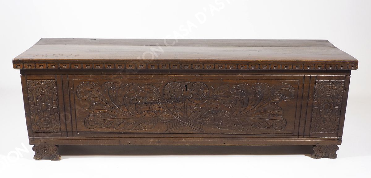 Cassapanca in legno con fronte intagliato a motivi floreali. cm. 48x146x46.