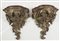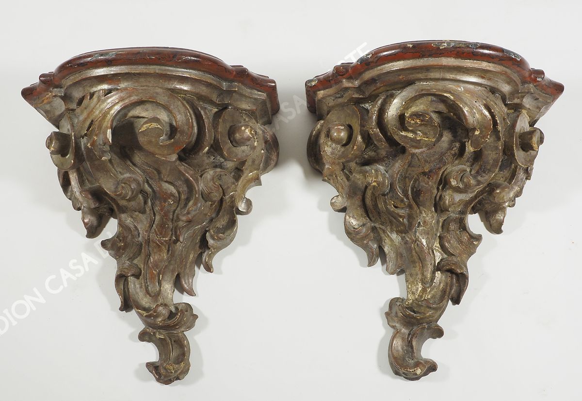 Coppia di mensole in legno argentato intagliate a volute. H. cm. 42.
