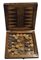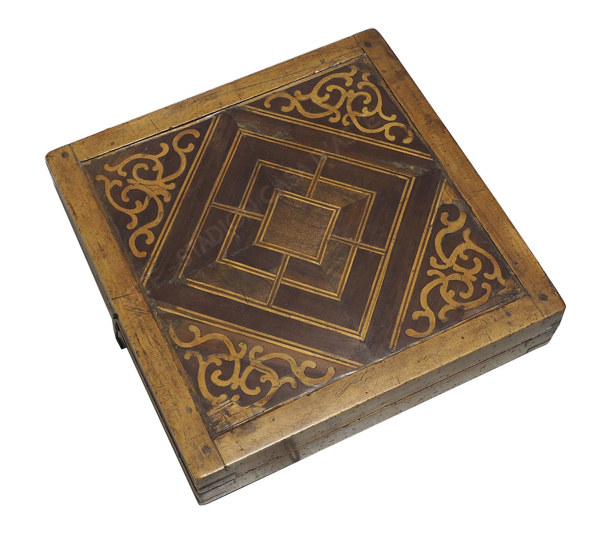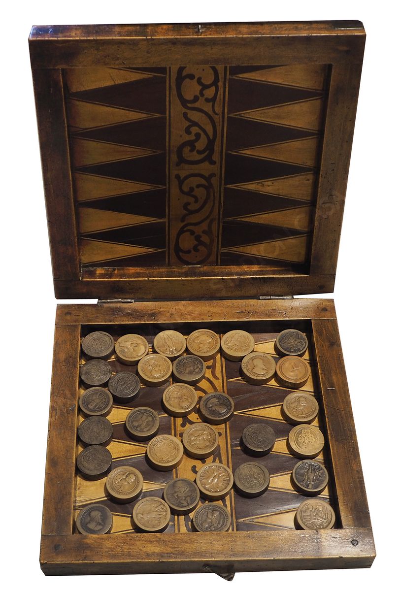 Antica scacchiera in legno interamente intarsiata in legni vari, interno con gioco del backgammon, pedine raffiguranti volti di imperatori e loro familiari. cm. 11x38x38.