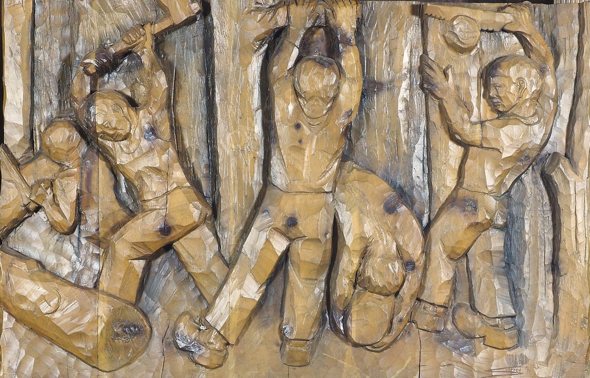 Altorilievo in legno finemente scolpito raffigurante lavorato. Firmato b. a...