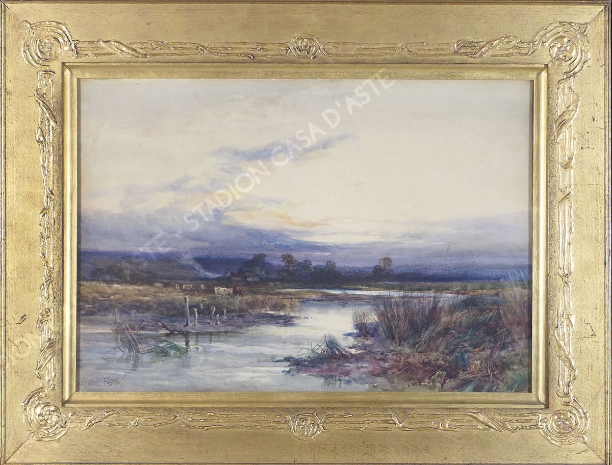 Gilbert Foster 1855-1906 "Paesaggio al tramonto" cm. 37x55 - acquerello su...