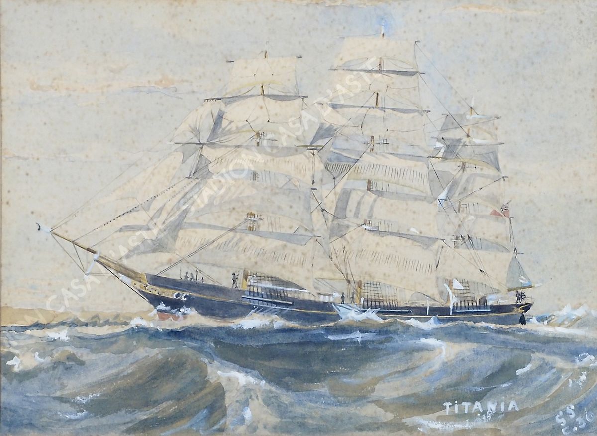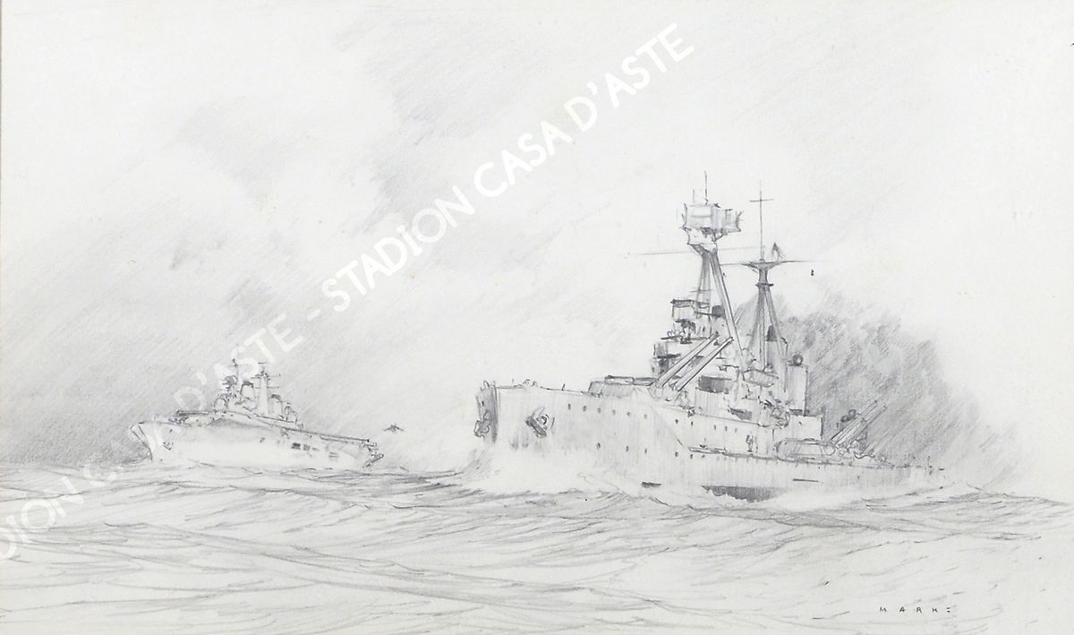 Lotto di 2 opere raffiguranti nave da guerra e veliero, incorniciati, Misure...