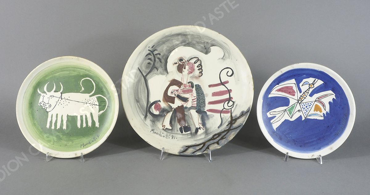 Cesare Mocchiutti 1916-2006 Lotto di 3 piatti in ceramica policroma, due...