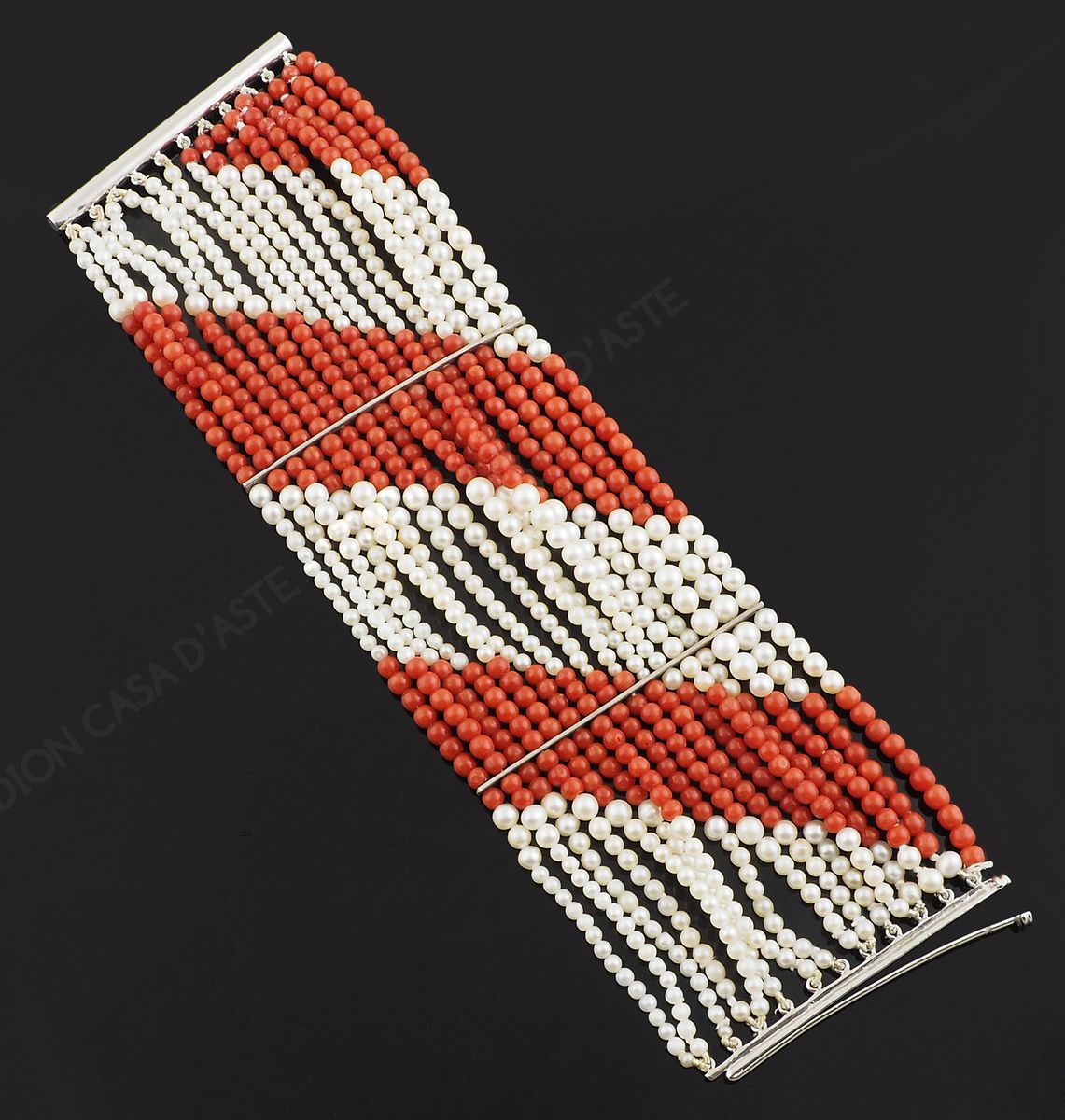 Bracciale a 16 fili di perle Akoya alternate da sfere di corallo rosso mediterraneo, chiusura a baionetta in oro bianco