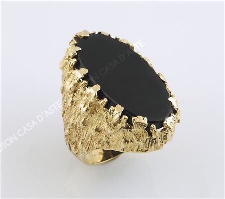 Anello in oro giallo di forma ovale lavorato a sbalzo, con pietra centrale nera.