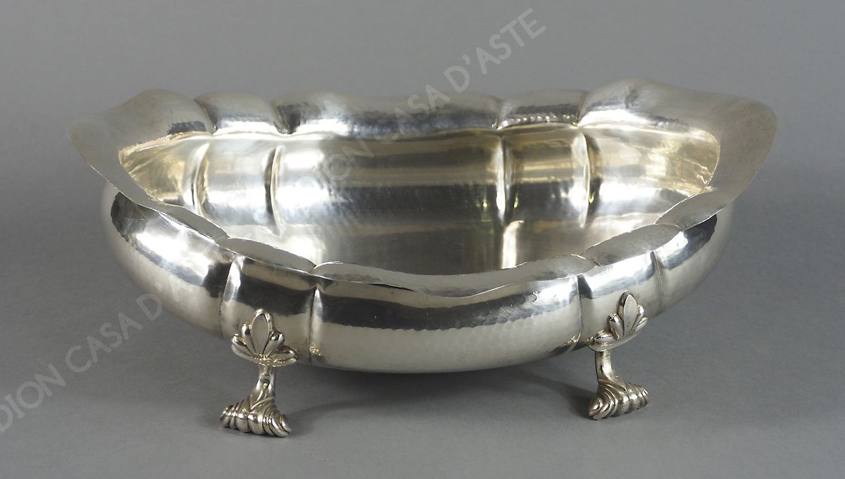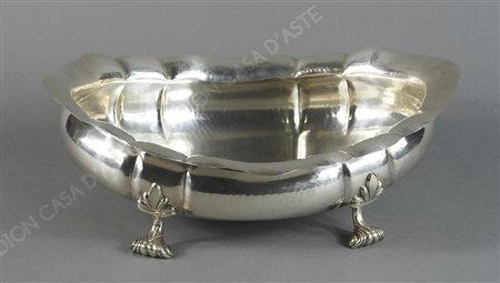 Centrotavola ovale in argento poggiante su 4 zampe ferine. cm. 25x33. gr. 800.