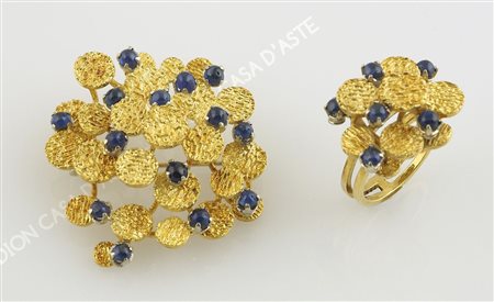 Parure in oro giallo e pietre blu con pietre blu a motivi floreali composta da spilla e anello.