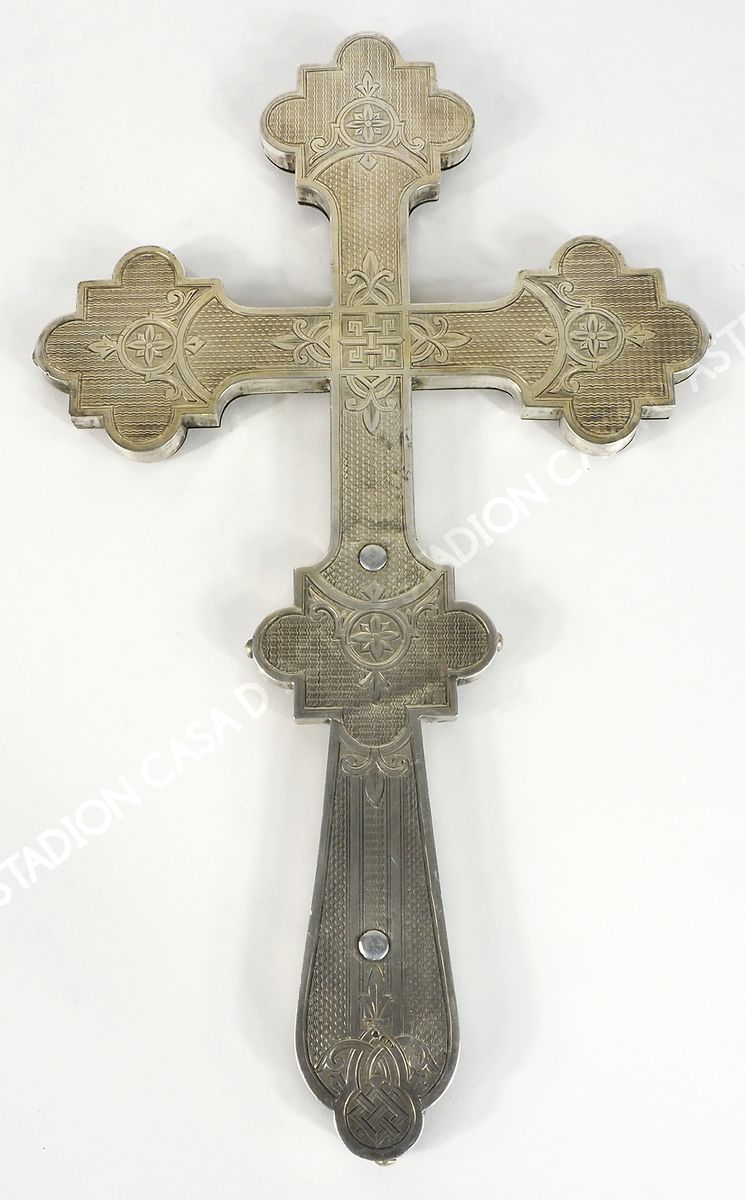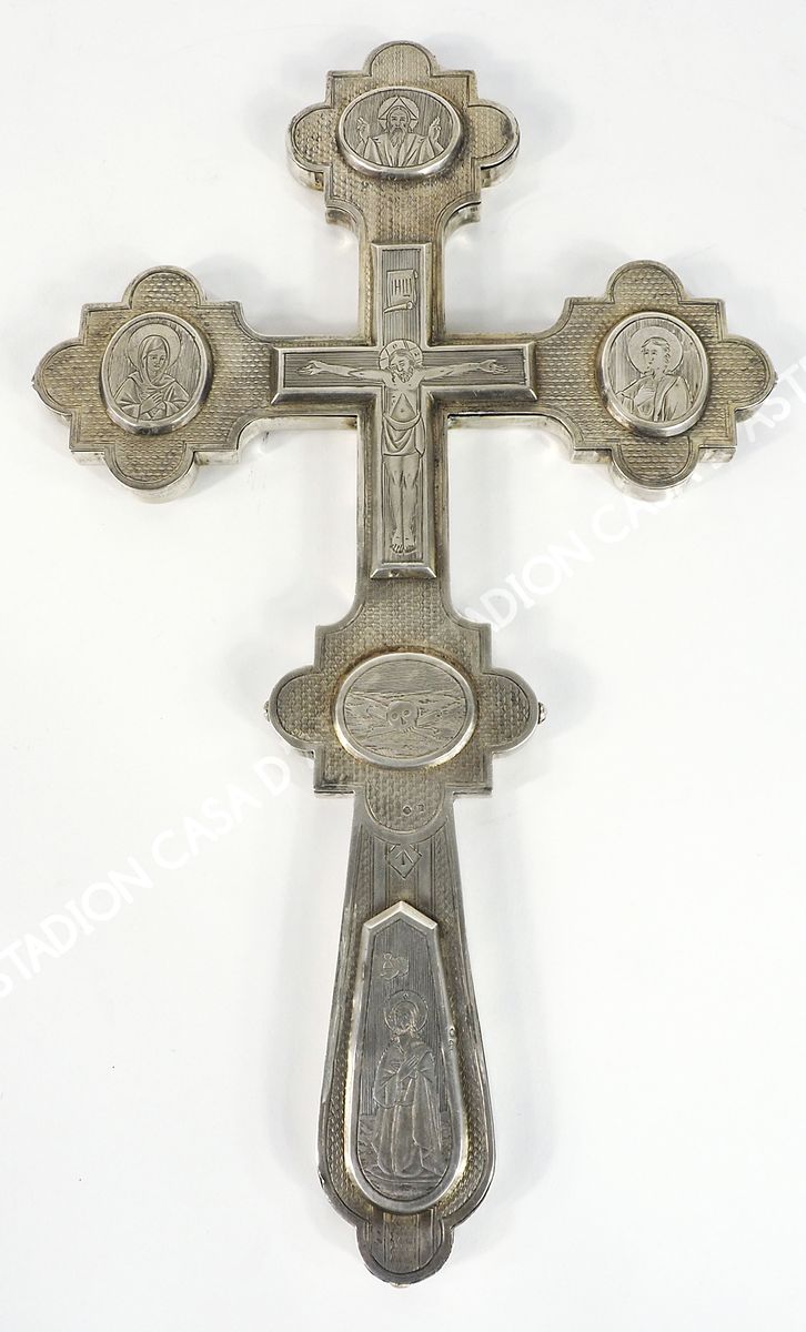 Croce in argento finemente incisa con figure di santi. Russia, inizio XX secolo. H. cm. 33,5.