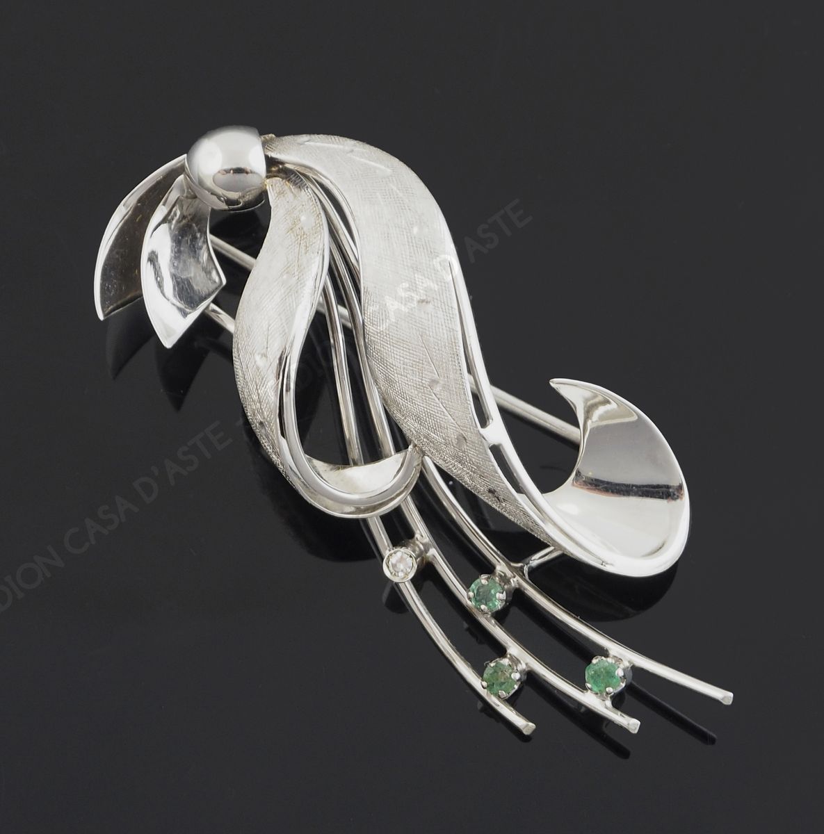 Spilla in oro bianco satinato lavorazione floreale, gr 5,7