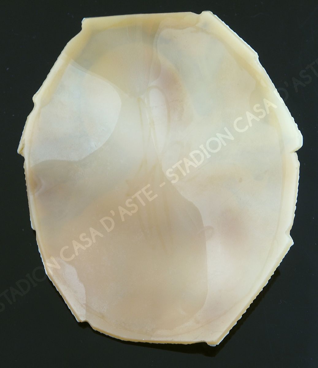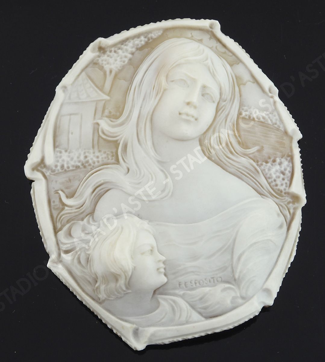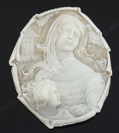 Cammeo in conchglia raffigurante mamma con bambino, cm 9x7. Firmato F...
