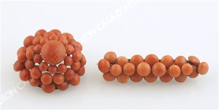 Lotto composto da due spille in corallo, una a barretta una a cupola