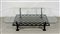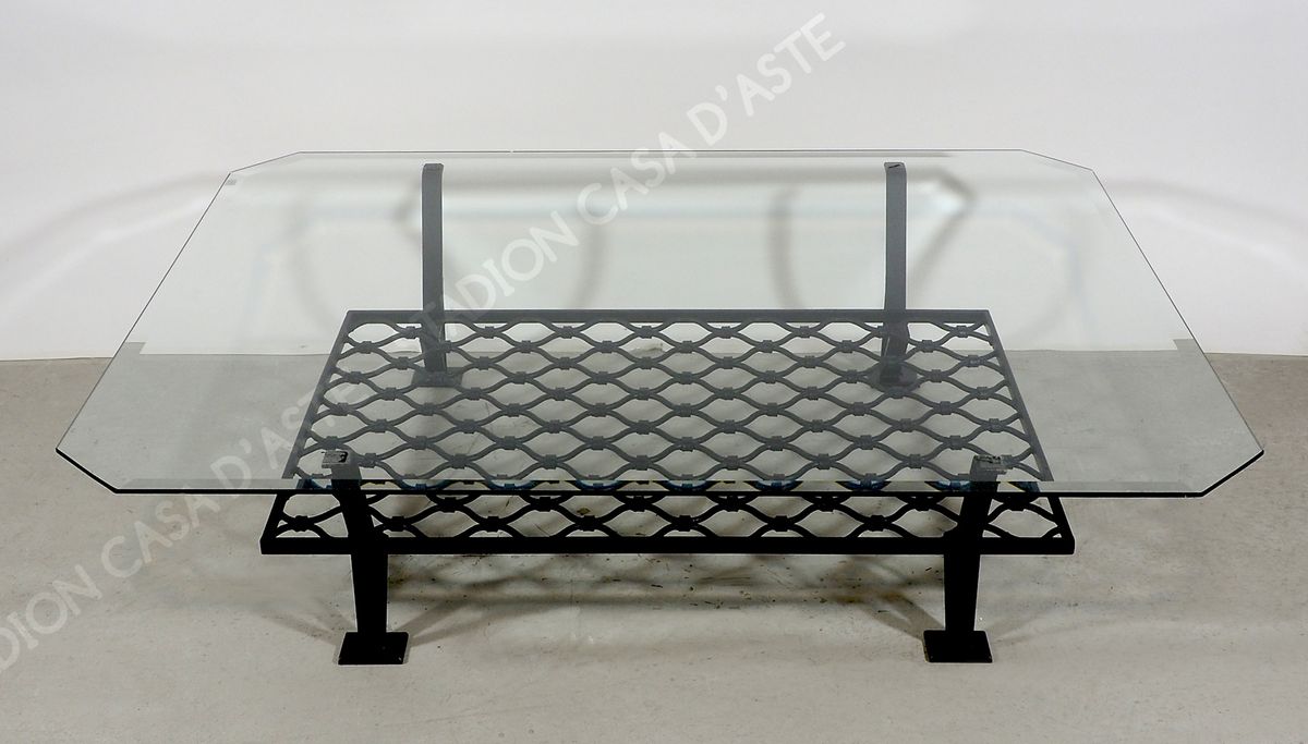 Tavolo basso in ferro battuto nero con piano in cristallo.