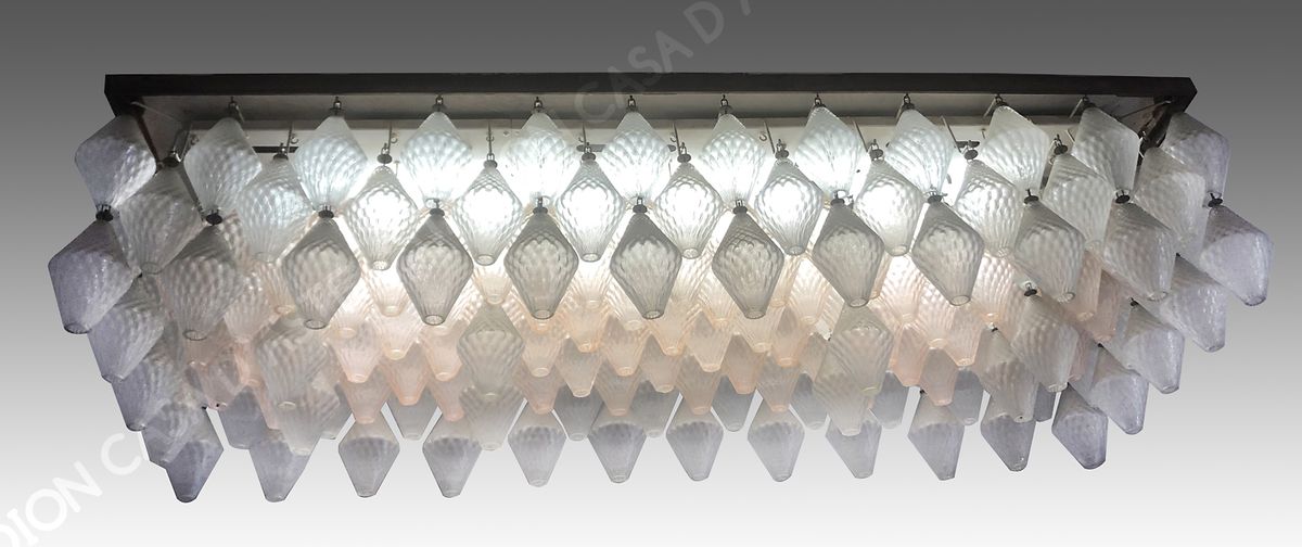 Salviati: grande lampadario rettangolare in vetro di Murano a 2 colori di forma romboidale, struttura in ferro dipinto. Anni '60. cm. 160x60.