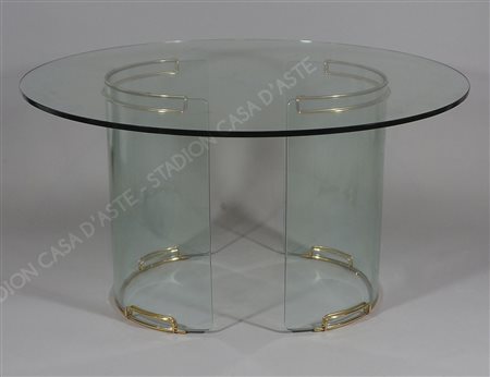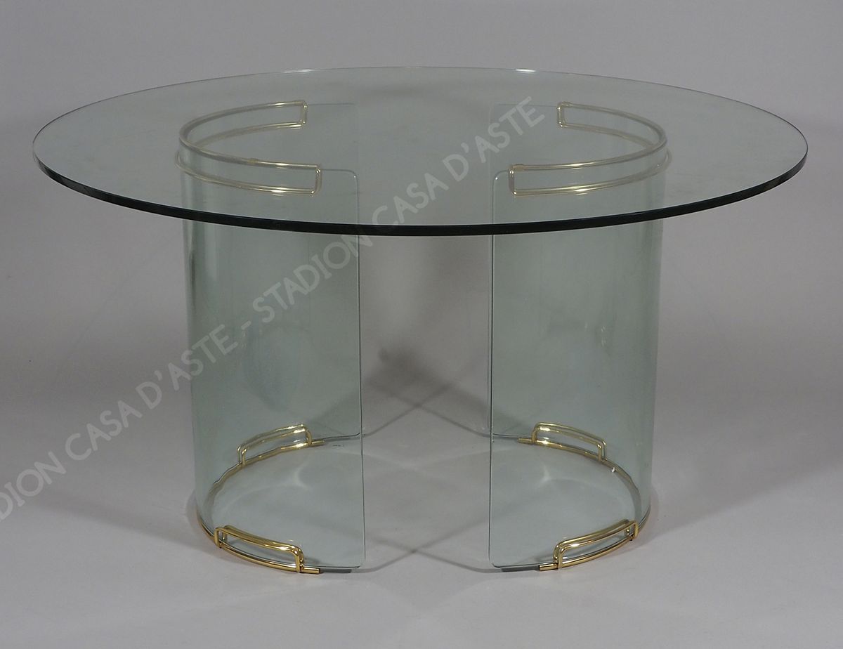 Gallotti & Radice: tavolo rotondo con piano in cristallo modello Adam, disegno di L. Massoni, 1968. H. cm. 74, diam. m. 130.