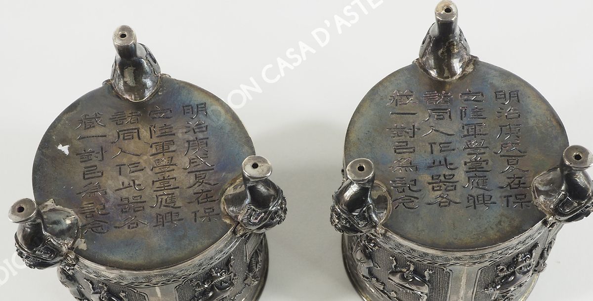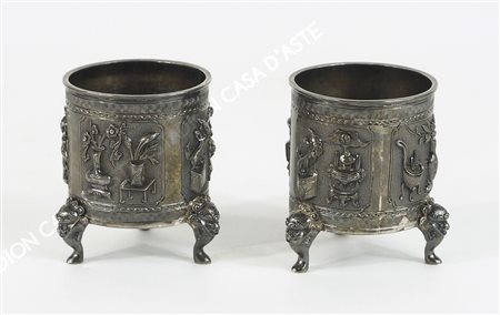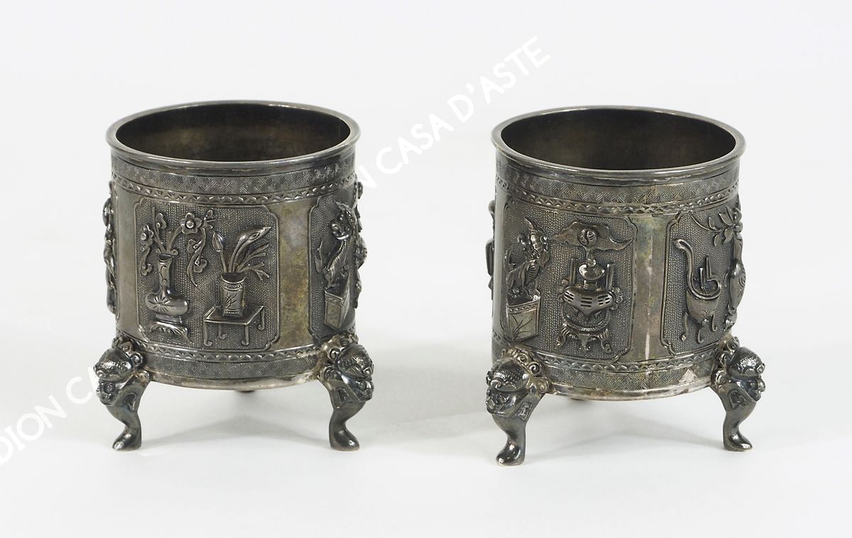 Coppia di contenitori in argento sbalzato con figure femminili e fiori. Reca iscrizioni incise sotto la base. Giappone, inizio XX secolo. H. cm. 7.