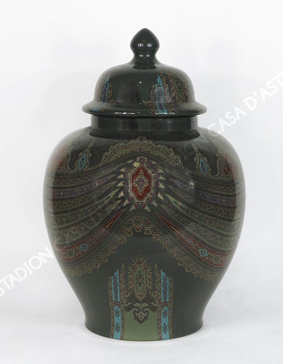 Etro: grande vaso in ceramica policroma con coperchio. Firmato sotto la base...