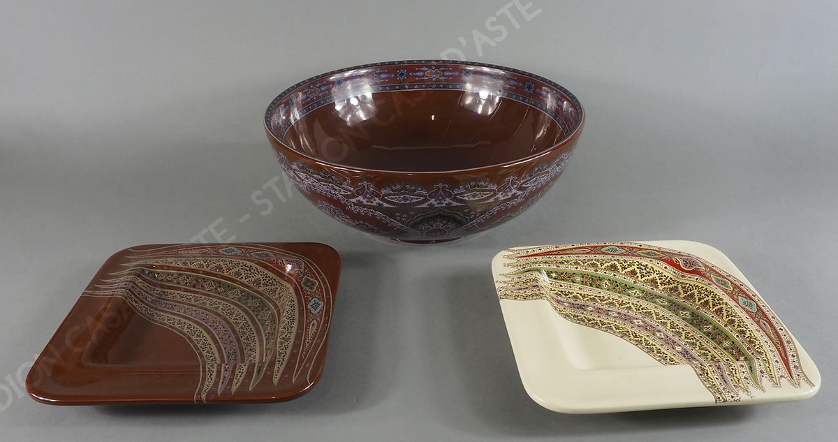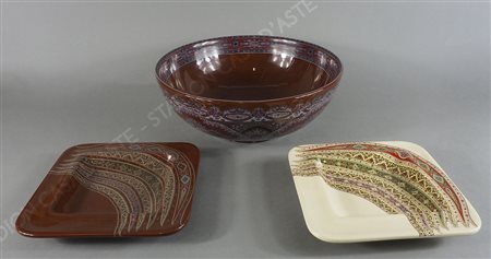 Etrò Lotto di tre oggetti in ceramica policroma. Misure diverse.