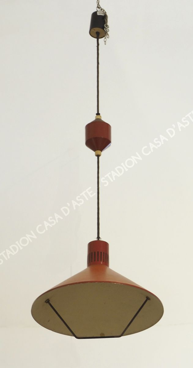 Stilnovo: lampada a sospensione in metallo rosso con etichetta originale.