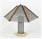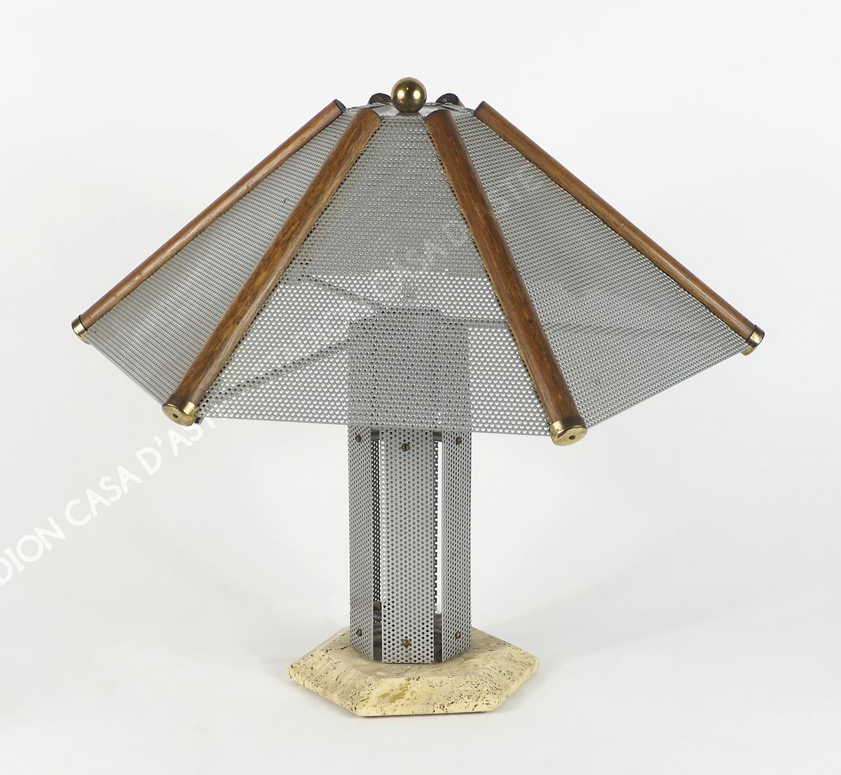 Lampada da tavolo a sezione esagonale con base in pietra e struttura in metallo a griglia e legno. H. cm. 46.