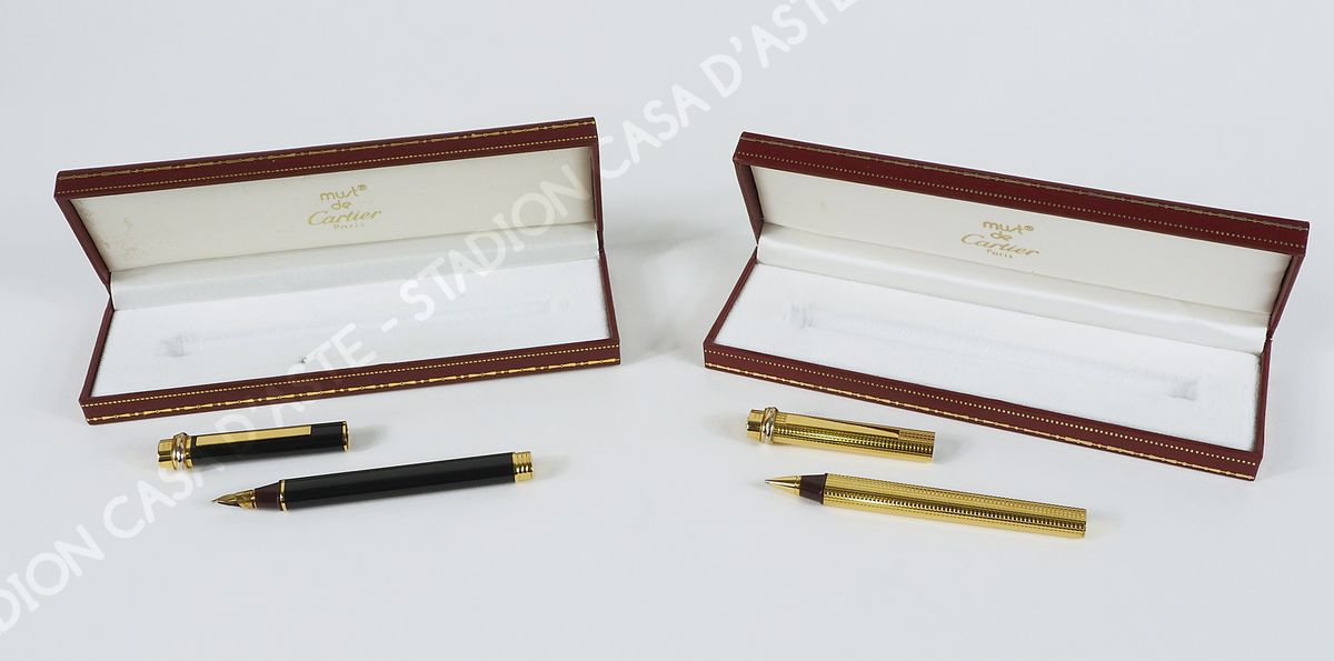 Cartier: lotto di 2 penne, una in oro giallo. Entro astucci originali.