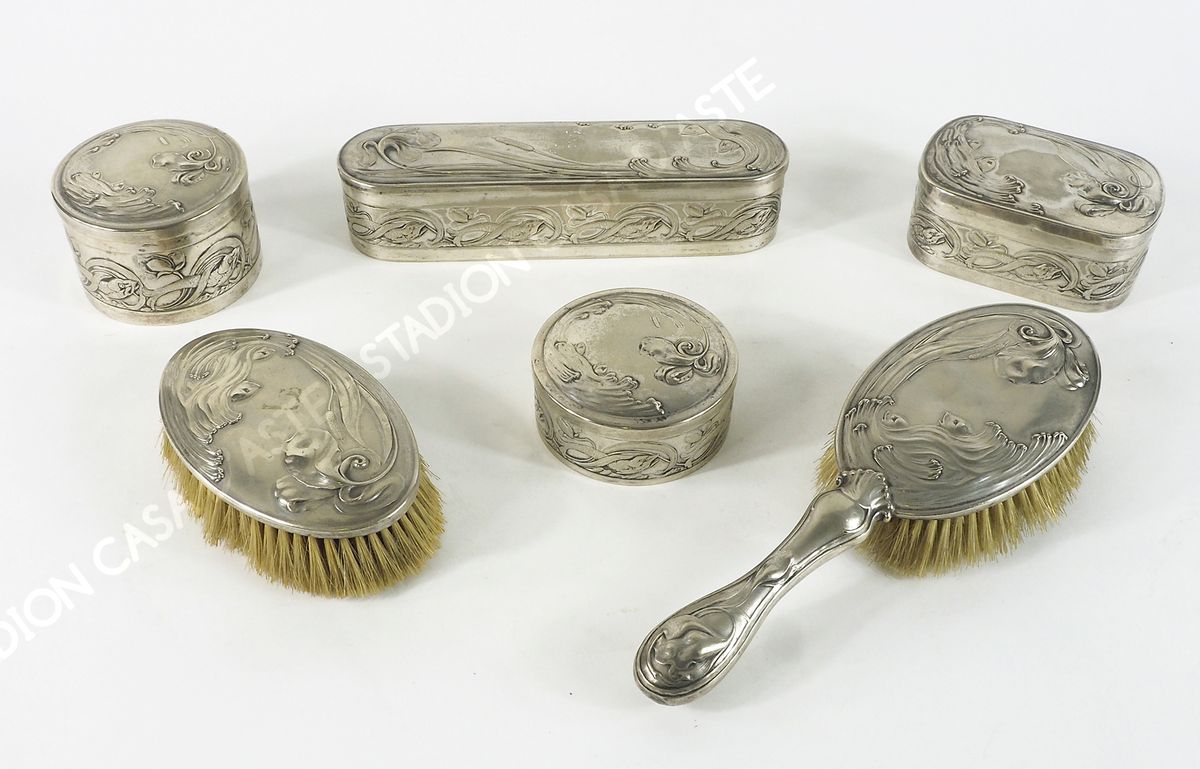 WMF: set da toilette in alpacca decorato a motivi Art Nouveau in rilievo....