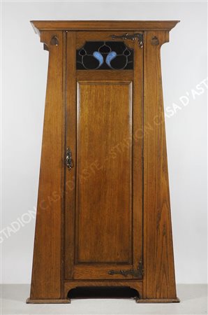 Armadio appendi-abiti con anta in legno e vetri colorati, fianchi mossi con cuoricini nella parte superiore, ai fianchi portaombrelli. Inghilterra, inizio XX secolo. cm. 200x107x48.