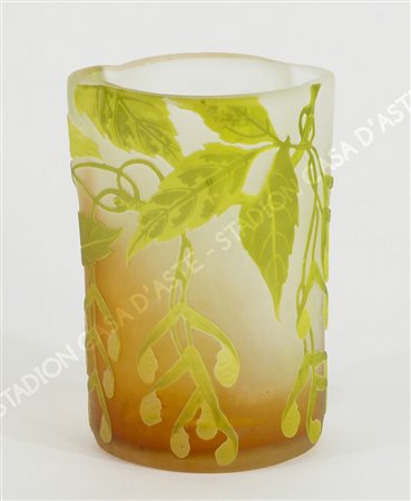 Gallé: vaso di forma ovale in vetro decorato con rami fioriti verdi. Firmato....