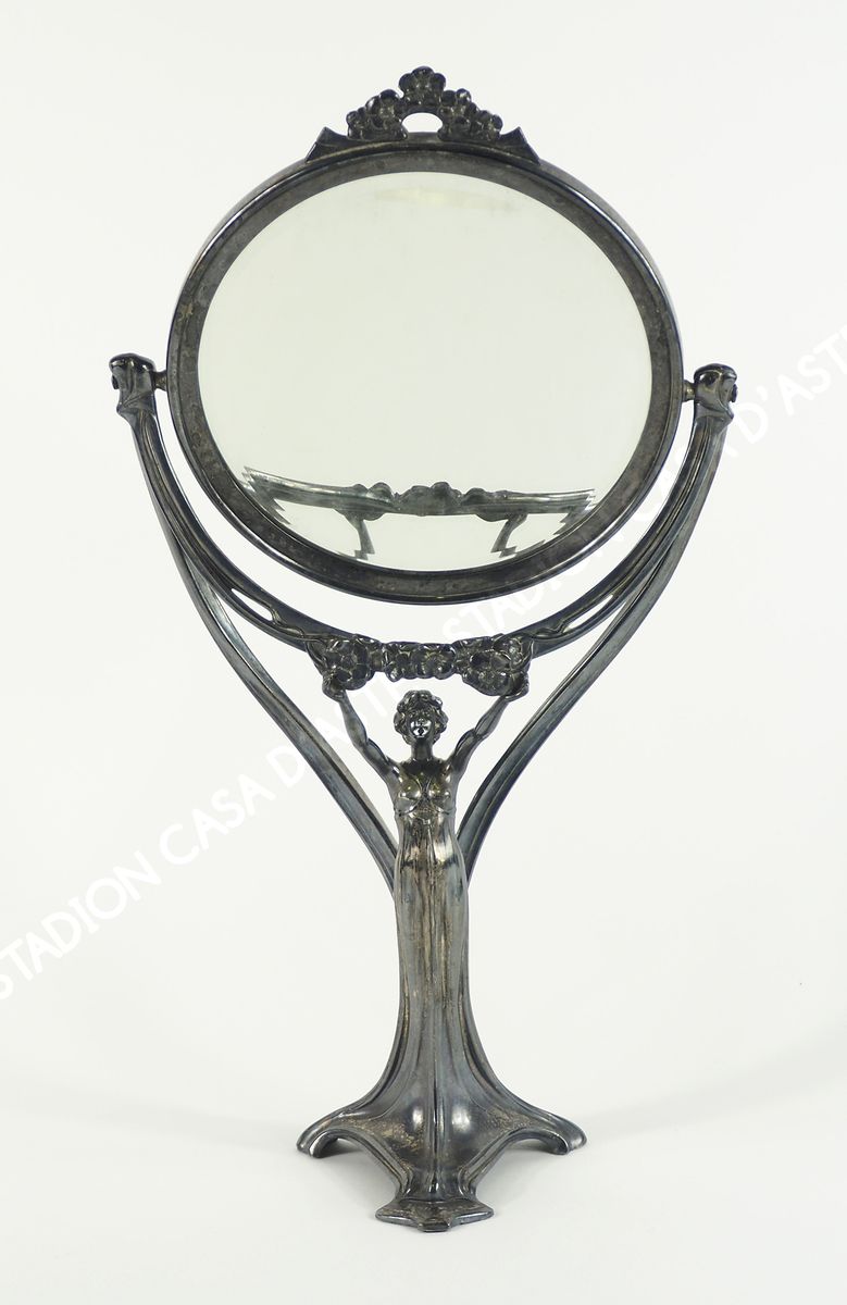 Specchio basculante da tavolo in peltro sorretto da figura femminile. Epoca...