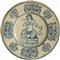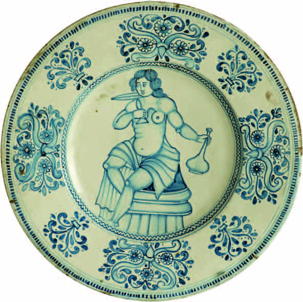 Piatto in maiolica istoriato in monocromo blu, Laterza, bottega A.A. d’Alessandro, fine del XVII secolo, con figura muliebre assisa al centro ed elementi floreali stilizzati sulla tesa. Diametro cm 23 Un esemplare della stessa serie appartiene alle collezioni del Fitzwilliam Museum di Cambridge ed è discusso in catalogo (cfr. J.E. Poole, Italian maiolica and incised slipware in the Fitzwilliam Museum - Cambridge, 1995, n. 495 - con bibliografia aggiornata), evidenziando la compresenza di elementi ornamentali analoghi sui rari pezzi noti firmati dal maestro laertino.